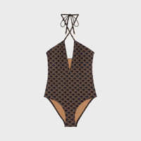 ONE-PIECE V-NECK MONOGRAMMED SWIMSUIT IN MATTE JERSEY DETAILS 72% NYLON 28% ELASTANE 76% NYLON 24% ELASTANE FILLING CLASSIC FIT CROSSOVER V-NECK TIE CLOSURES IN THE BACK WITH TRIOMPHE AGLETS MADE IN FRANCE REFERENCE : 2Z306939T.17BR