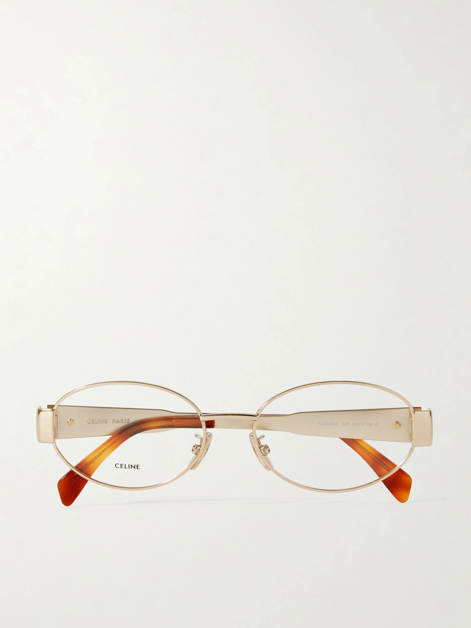 We love how CELINE Eyewear's glasses can be worn as is or with the clear lenses swapped out for prescription or UV-protective ones. Made from polished pale gold-tone metal, they have retro val lenses and wide arms adorned with carved 'Triomphe' logos. Adjustable nose pads and acetate tips keep them comfortable. Details & Care - Pale gold-tone metal - Can be fitted with prescription or UV-protective lenses