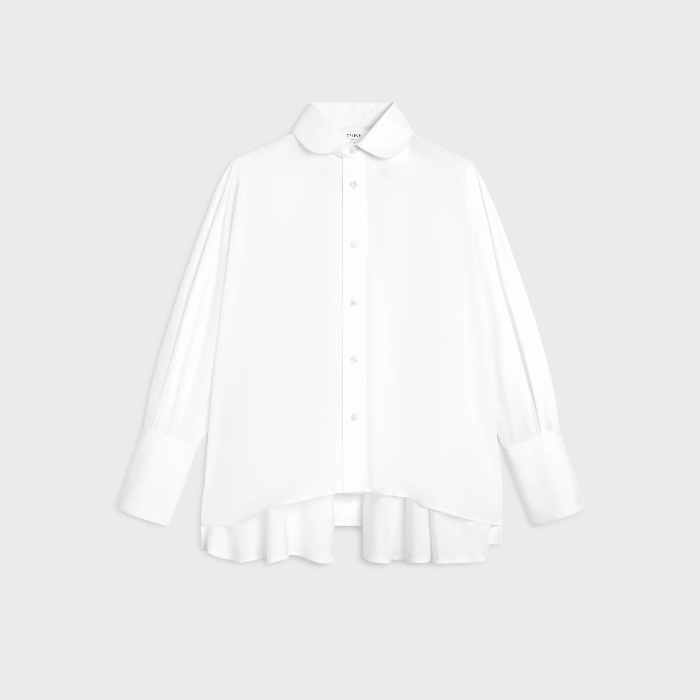 DETAILS 100% COTTON TRIOMPHE EMBROIDERY ON THE CUFFS OVERSIZED FIT CLAUDINE COLLAR 7 CELINE PARIS-ENGRAVED MOTHER-OF-PEARL BUTTONS 2 CELINE PARIS-ENGRAVED MOTHER-OF-PEARL BUTTONS ON THE CUFFS MADE IN ITALY REFERENCE : RC0DL0T01.01BC
