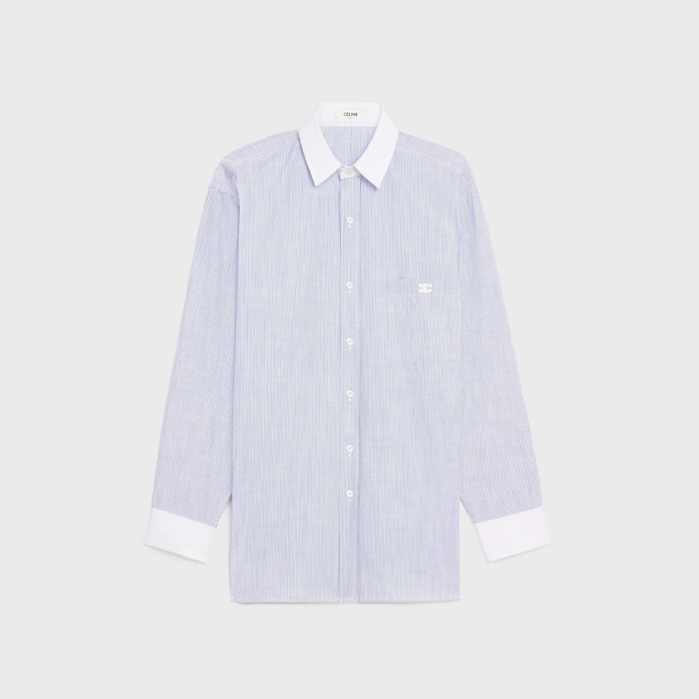 OVERSIZED SHIRT WITH DRUGSTORE COLLAR IN STRIPED CHAMBRAY COTTON DETAILS 100% COTTON TRIOMPHE EMBROIDERY ON THE CHEST LOOSE FIT CONTRASTING DRUGSTORE COLLAR 1 PATCH POCKET ON THE CHEST CONTRASTING BUTTONED CUFFS 7 MOTHER-OF-PEARL BUTTONS 1 MOTHER-OF-PEARL BUTTON ON THE CUFFS ROUNDED FRONT, TAPERED SIDES MADE IN ITALY REFERENCE : 2C775602P.01CX
