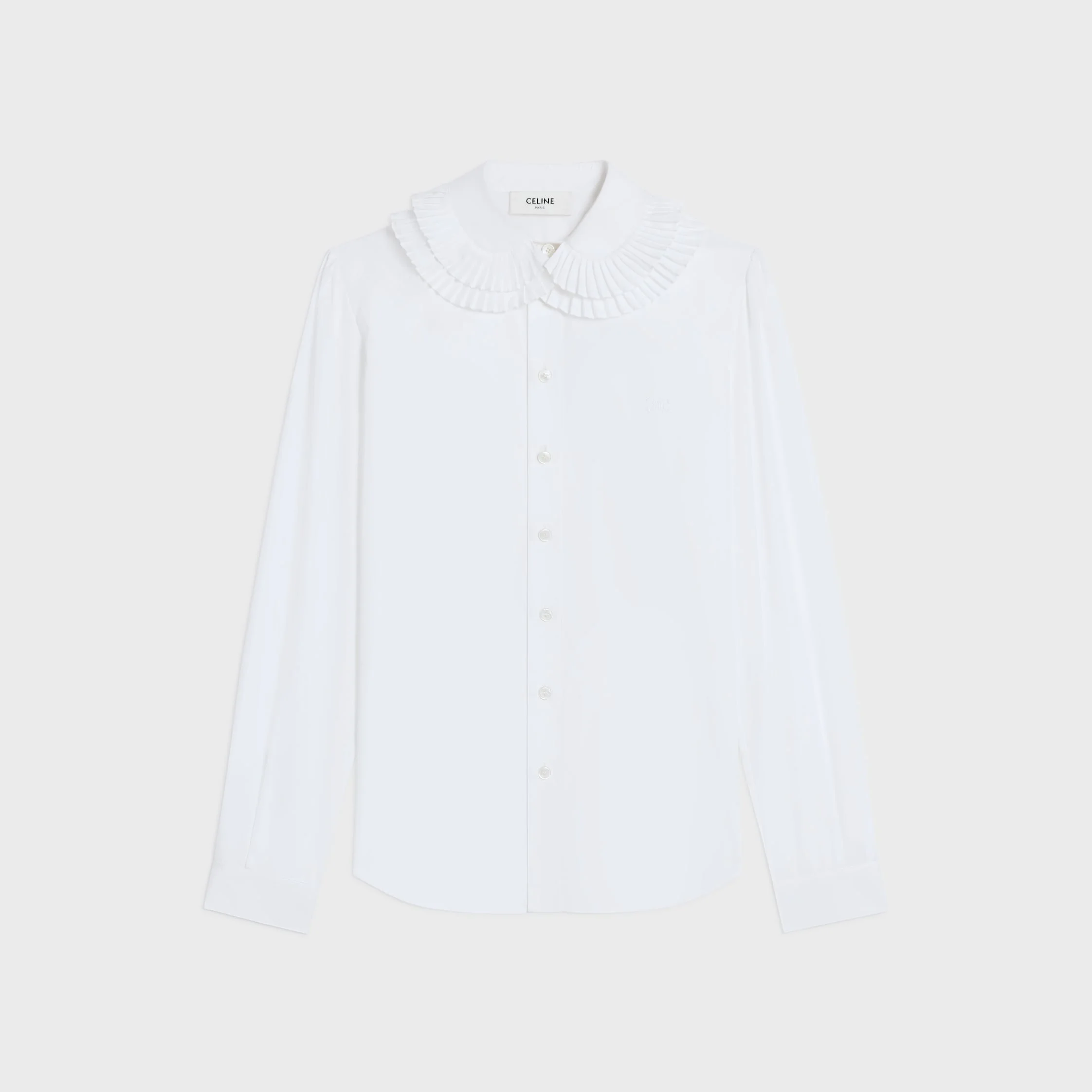 DETAILS 100% COTTON TRIOMPHE EMBROIDERY PLEATED DOUBLE CLAUDINE COLLAR BUTTONED CUFFS 8 MOTHER-OF-PEARL BUTTONS 1 MOTHER-OF-PEARL BUTTON ON THE CUFFS MADE IN ITALY REFERENCE : RC07T0T01.01BC