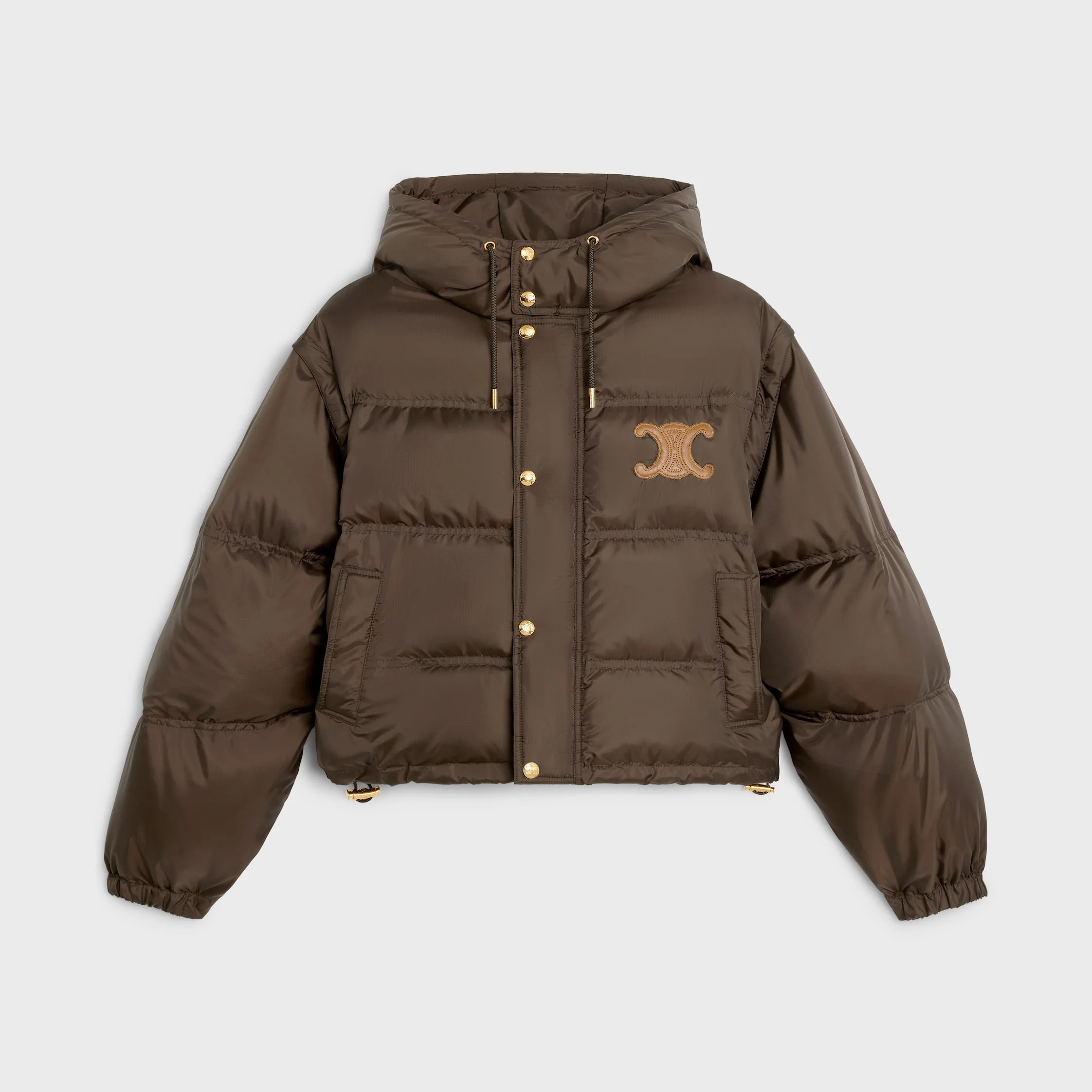 CROPPED DOWN JACKET WITH TRIOMPHE PATCH IN LIGHTWEIGHT NYLON DETAILS 100% POLYAMIDE LINING 100% POLYAMIDE LEATHER PART 100% LAMBSKIN TRIOMPHE PATCH CLASSIC FIT CROPPED LENGTH HIGH COLLAR WITH HOOD, ADJUSTABLE DRAWSTRINGS AND CELINE PARIS-ENGRAVED METAL AGLETS REMOVABLE SLEEVES 2 WELT POCKETS ELASTIC CUFFS WAISTBAND WITH ADJUSTABLE DRAWSTRING 6 TRIOMPHE SNAP BUTTONS MADE IN ITALY REFERENCE : 2W661901V.19CO
