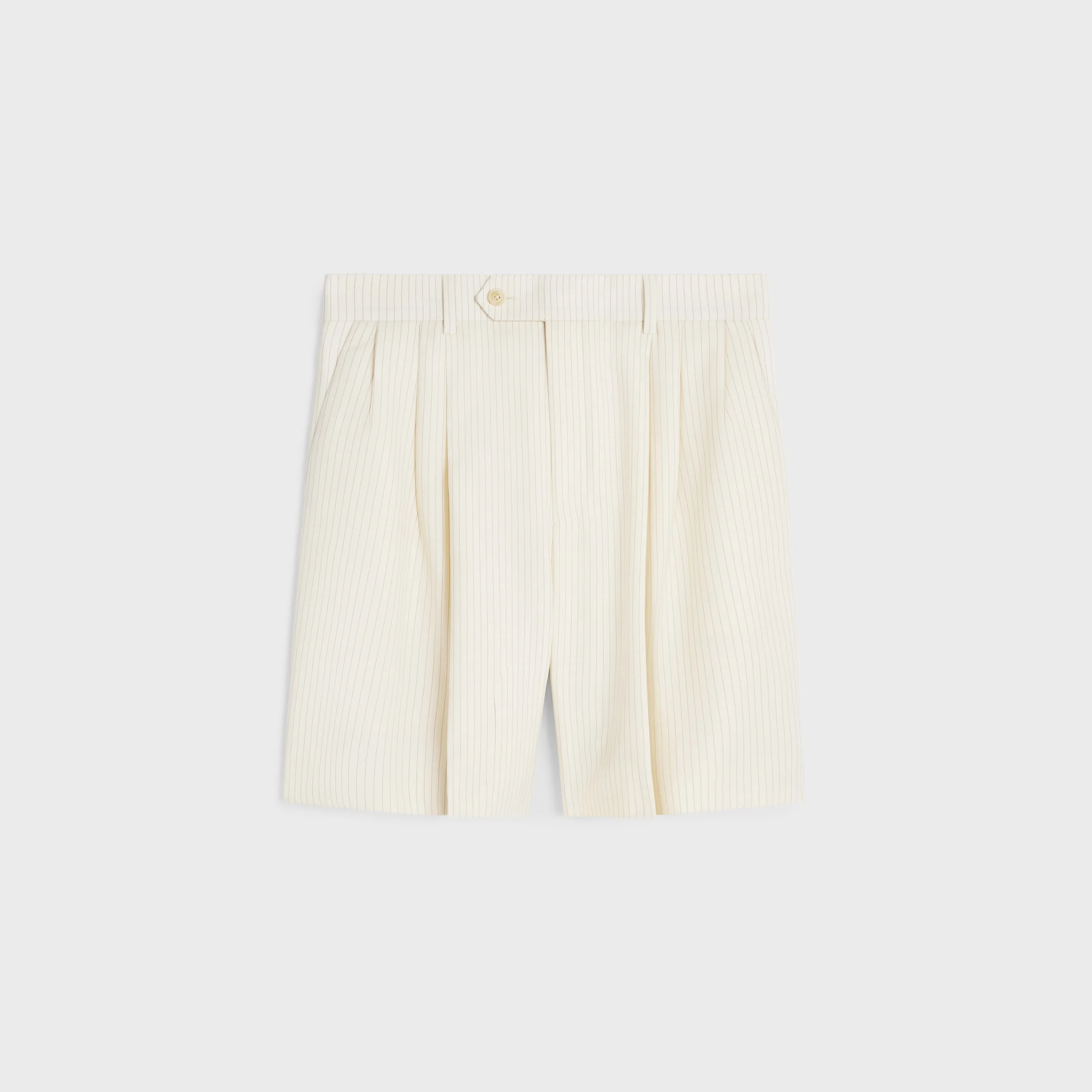 TRIPLE-PLEATED MEN’S SHORTS IN STRIPED LIGHTWEIGHT WOOL DETAILS 100% WOOL LINING 54% CUPRO 46% VISCOSE CLASSIC FIT HIGH WAIST 2 SIDE POCKETS 2 WELT POCKETS WITH BUTTON ON THE BACK TRIPLE-PLEATED ZIP AND BUTTON CLOSURE MADE IN ITALY REFERENCE : 2P854447T.97IR