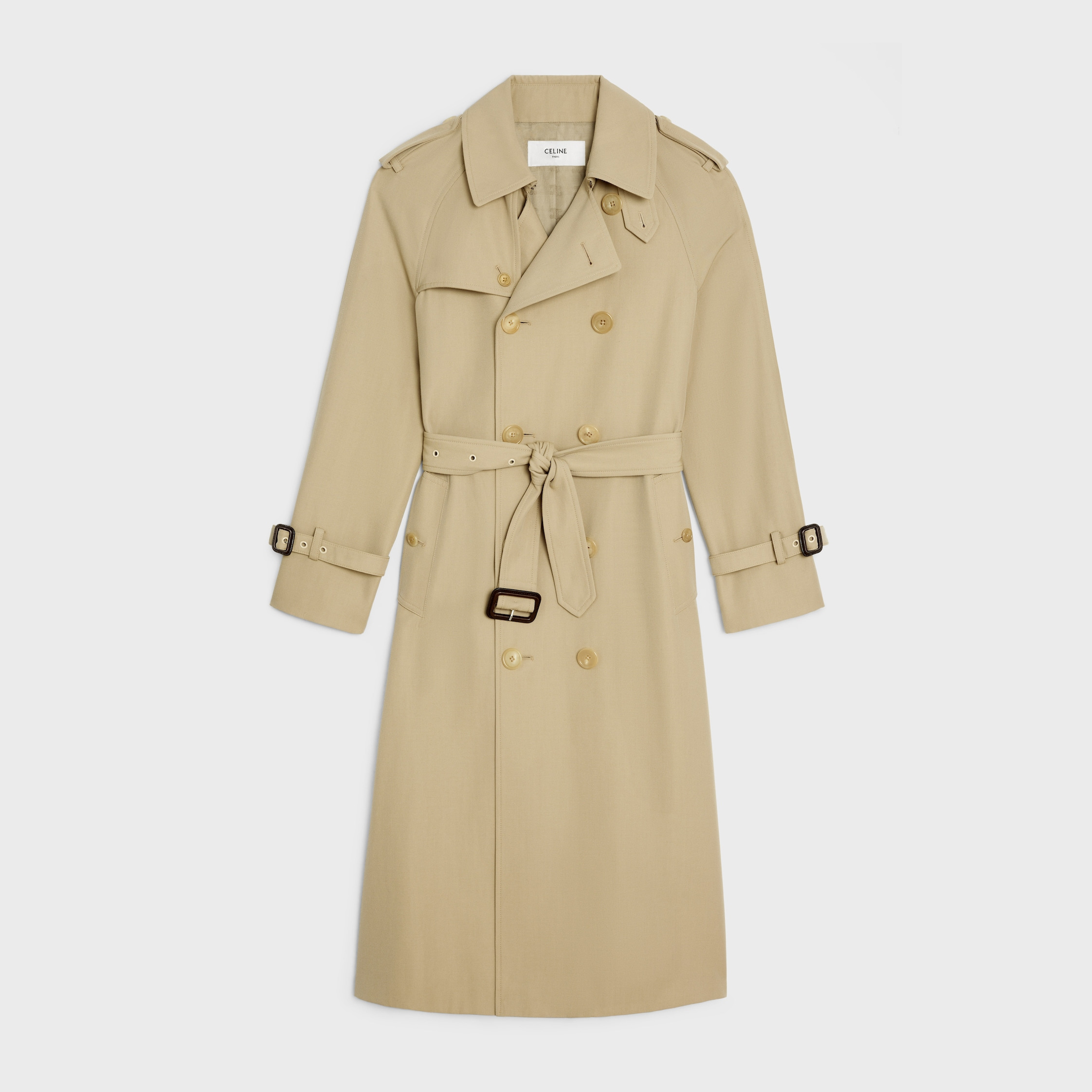 WILTERN TRENCH COAT IN COTTON GABARDINE DETAILS 62% WOOL 38% COTTON LINING 50% RAYON 50% VISCOSE LOOSE FIT 2 RAGLAN POCKETS INSIDE POCKET GUN FLAP ON THE CHEST AND BACK CHIN STRAP LONG RAGLAN SLEEVES 2 ADJUSTMENT TABS ON THE CUFFS 2 SHOULDER TABS FABRIC BELT WITH LEATHER BUCKLE MIDDLE BACK VENT 11 CELINE PARIS-ENGRAVED HORN BUTTONS CELINE PARIS-ENGRAVED HORN BUTTON ON THE SHOULDER TABS, GUN FLAP, POCKETS AND COLLAR MADE IN ITALY REFERENCE : 2M96A777S.01TC