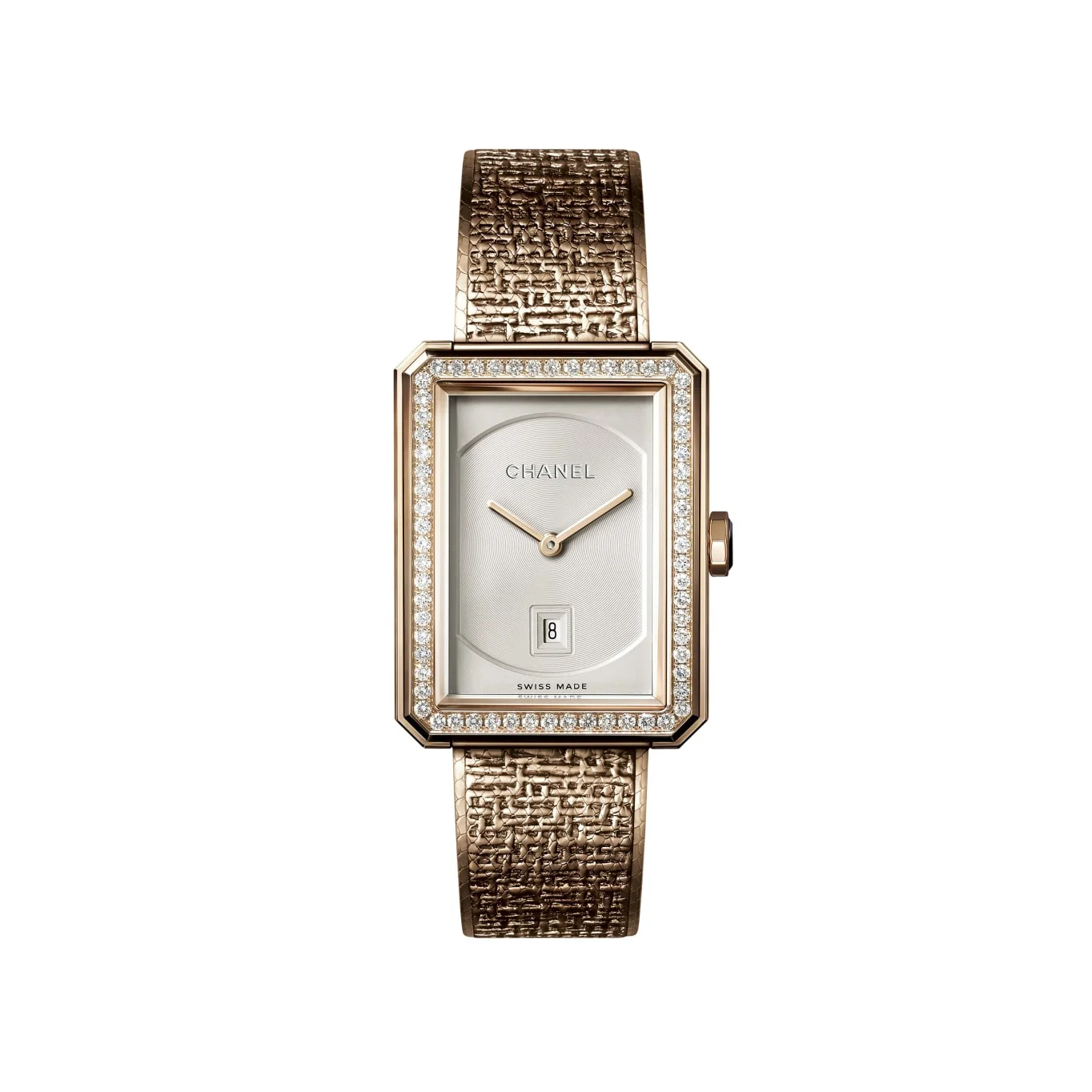 BOY·FRIEND TWEED Watch, Medium version, BEIGE GOLD and diamonds on the CHANEL website. Medium version, BEIGE GOLD and diamonds