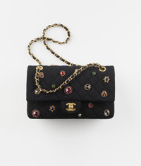 Flap Bags of the 2021/22 Métiers d’art collection: Classic Handbag, embroidered jersey, strass, glass pearls, sequins & gold-tone metal, black on the CHANEL official website. Embroidered Jersey, Strass, Glass Pearls, Sequins & Gold-Tone Metal DIMENSIONS 6 × 9.9 × 2.5 in