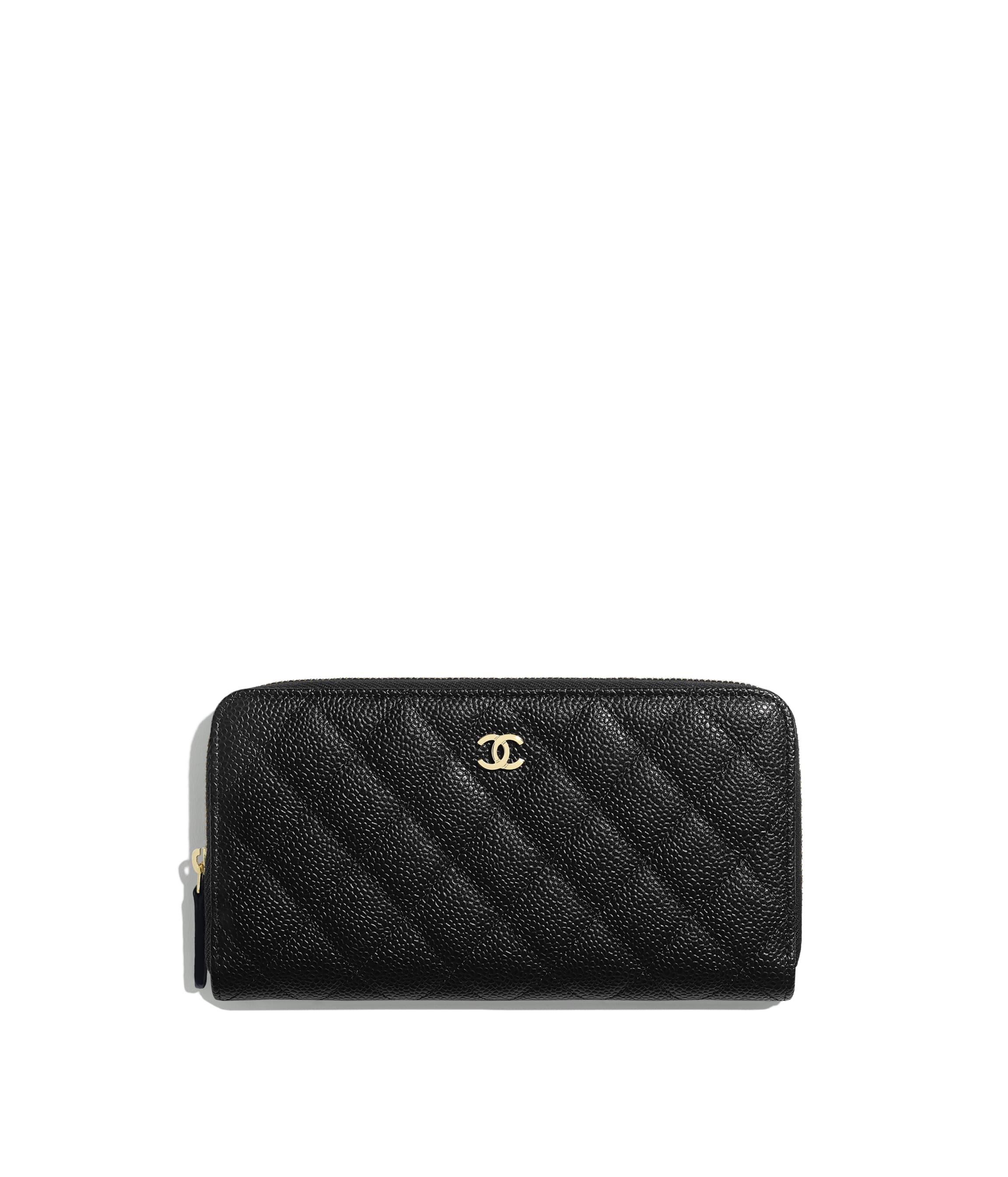 Long Wallets of the Reorders collection: Classic Long Zipped Wallet, grained calfskin & gold-tone metal, black on the CHANEL official website. Grained Calfskin & Gold-Tone Metal