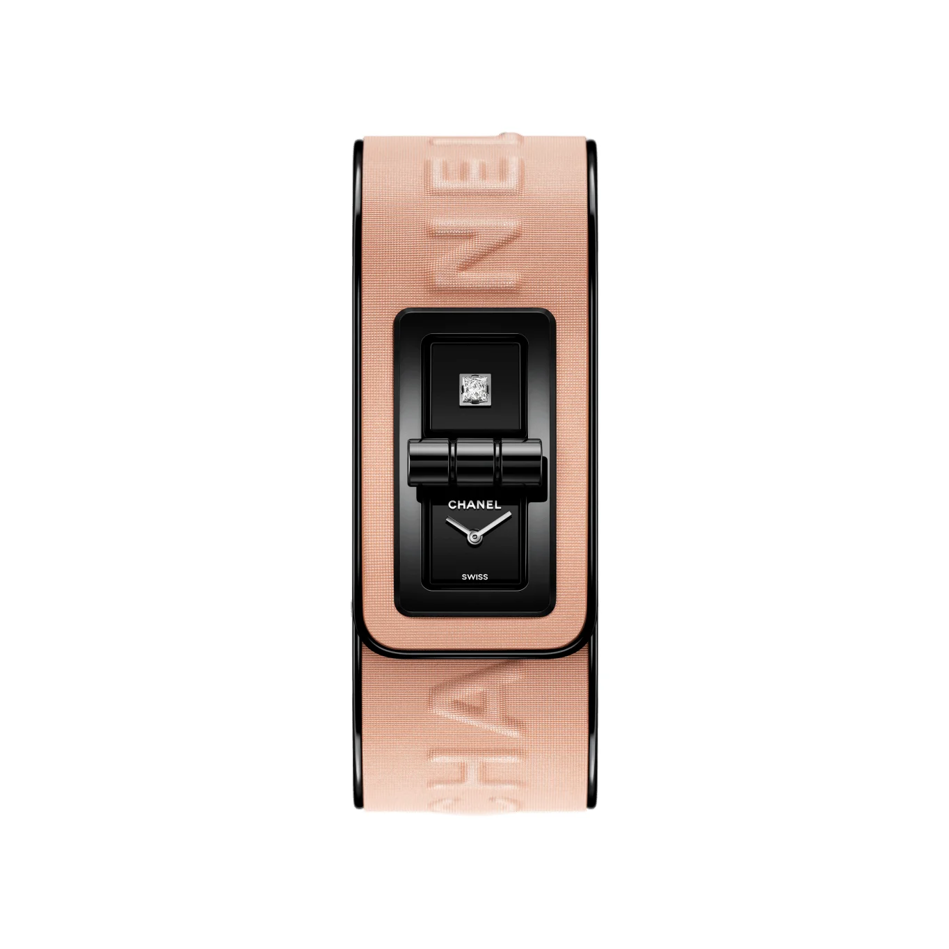 CODE COCO BLUSH WATCH, Black-coated steel, pink calfskin leather on the CHANEL website. Black-coated steel, pink calfskin leather