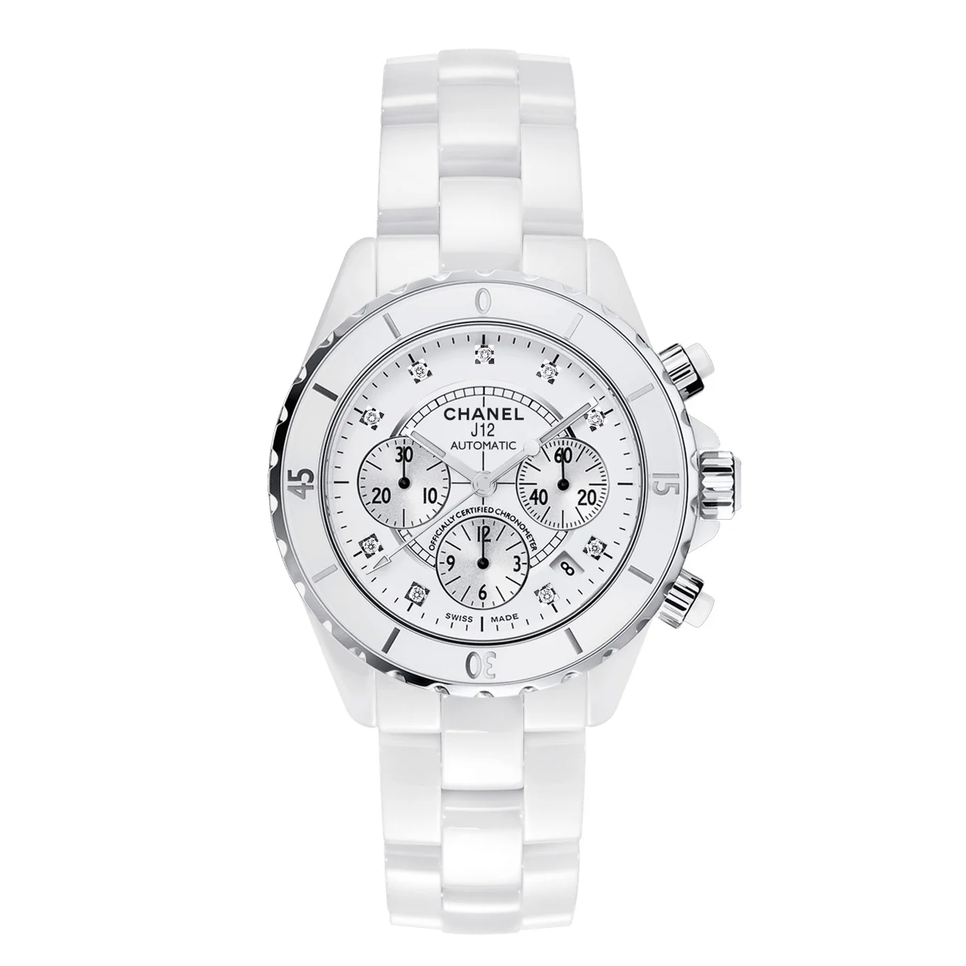 J12 Chronograph Watch, 41 mm, White highly resistant ceramic and steel, diamond indicators on the CHANEL website. White highly resistant ceramic and steel, diamond indicators