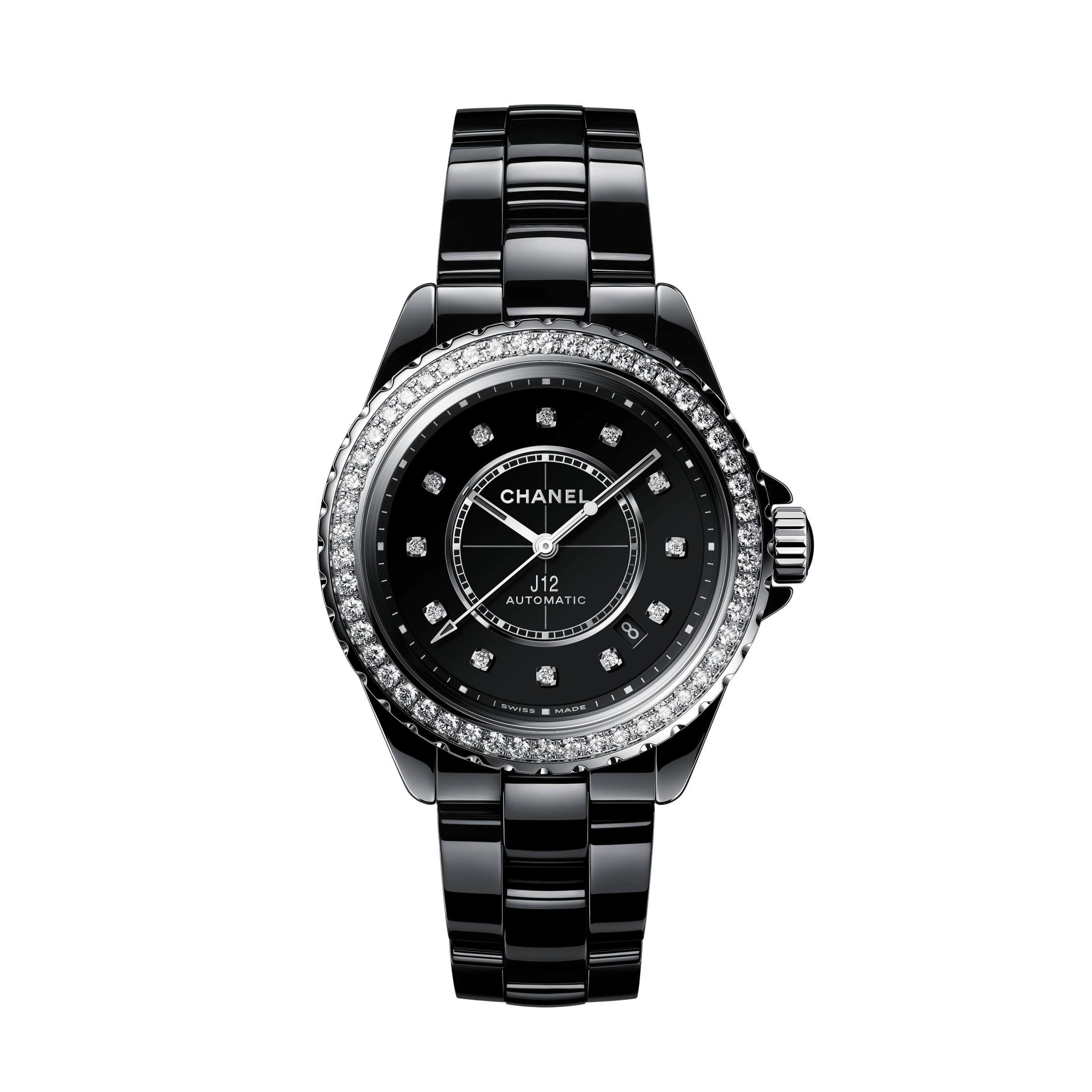 J12 Diamond Bezel Watch Caliber 12.1, 38 mm, Black highly resistant ceramic and steel, diamond bezel on the CHANEL website. Black highly resistant ceramic and steel, diamond bezel