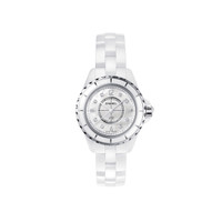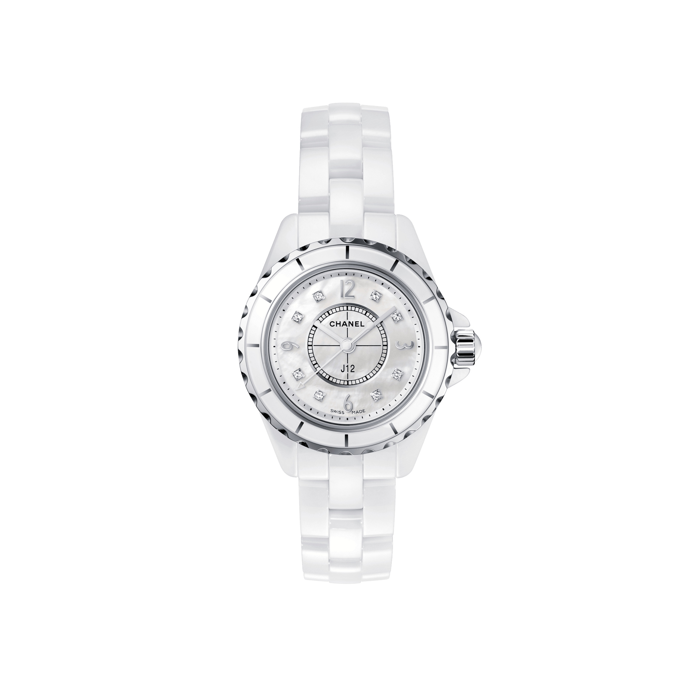 J12 Watch, 29 mm, White highly resistant ceramic and steel, diamond indicators, white mother-of-pearl dial on the CHANEL website. White highly resistant ceramic and steel, diamond indicators, white mother-of-pearl dial