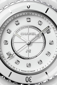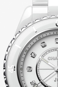 J12 Watch, 33 mm, White highly resistant ceramic and steel, diamond indicators on the CHANEL website. White highly resistant ceramic and steel, diamond indicators