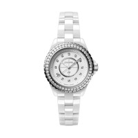 J12 Watch, 33 mm, White highly resistant ceramic and steel, diamond bezel and indicators on the CHANEL website. White highly resistant ceramic and steel, diamond bezel and indicators