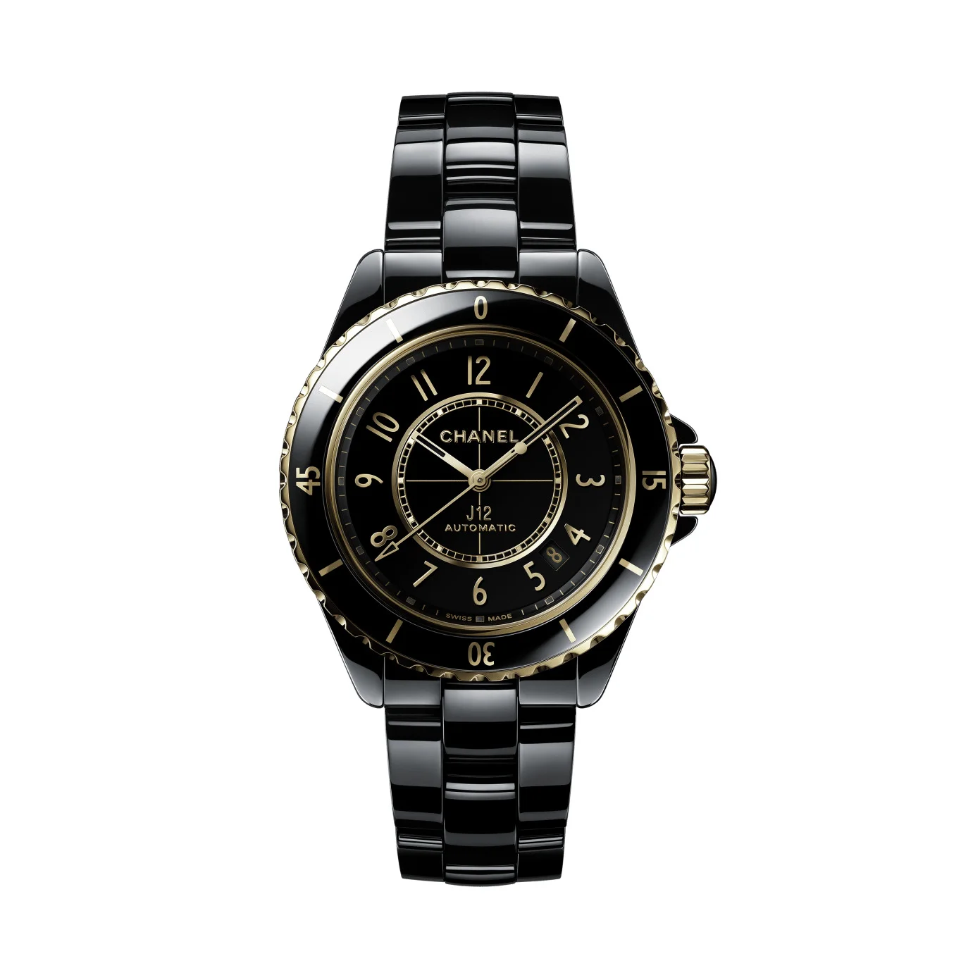 J12 Watch Caliber 12.1, 38 MM, Black highly resistant ceramic and 18K yellow gold on the CHANEL website. Black highly resistant ceramic and 18K yellow gold