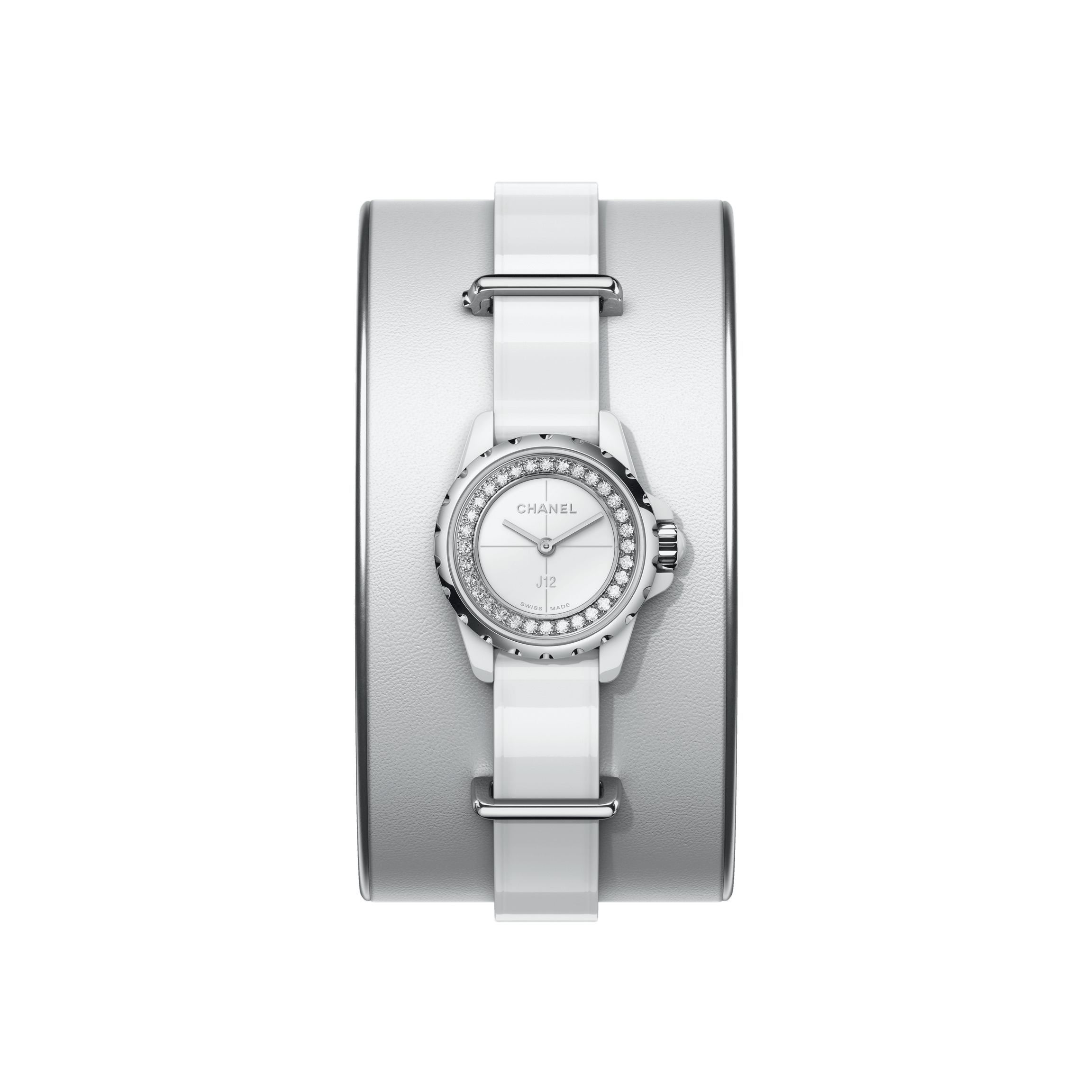 J12·XS Watch, 19 mm, Small white leather cuff, white highly resistant ceramic and steel, diamond flange on the CHANEL website. Small white leather cuff, white highly resistant ceramic and steel, diamond flange
