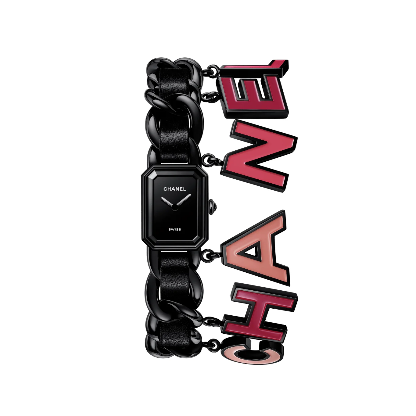 PREMIERE CHARMS BLUSH WATCH, Black-coated steel and black leather, black-lacquered dial on the CHANEL website. Black-coated steel and black leather, black-lacquered dial