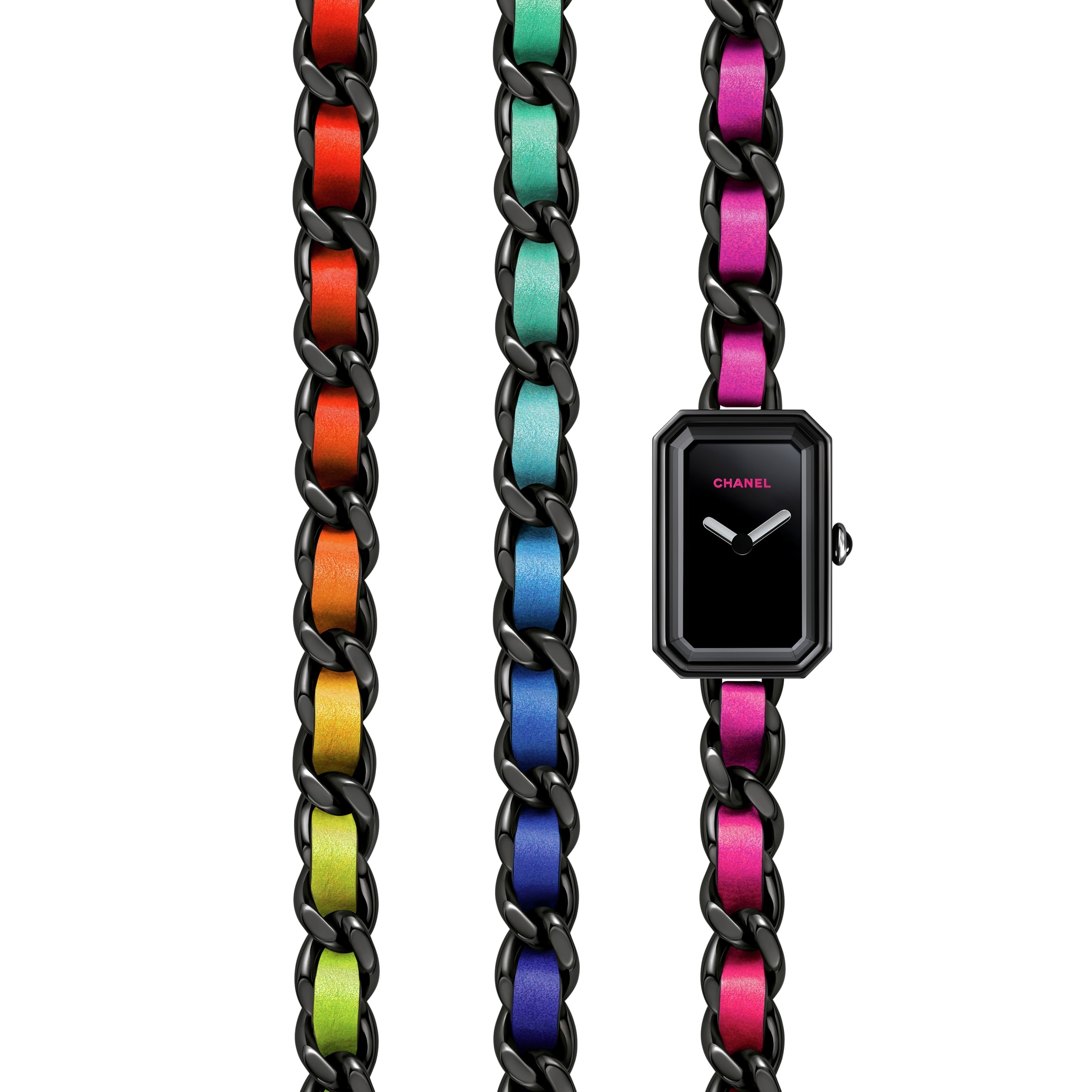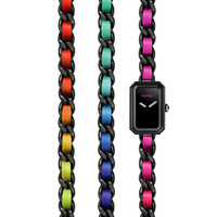 Première Electro Watch, Steel with black coating and neon rainbow leather, black lacquer dial on the CHANEL website. Steel with black coating and neon rainbow leather, black lacquer dial
