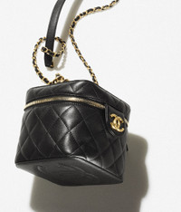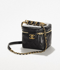 Vanity Cases of the Spring-Summer 2022 collection: Small Vanity Case, calfskin & gold-tone metal, black on the CHANEL official website. Calfskin & Gold-Tone Metal DIMENSIONS 5.1 × 5.9 × 5.9 in