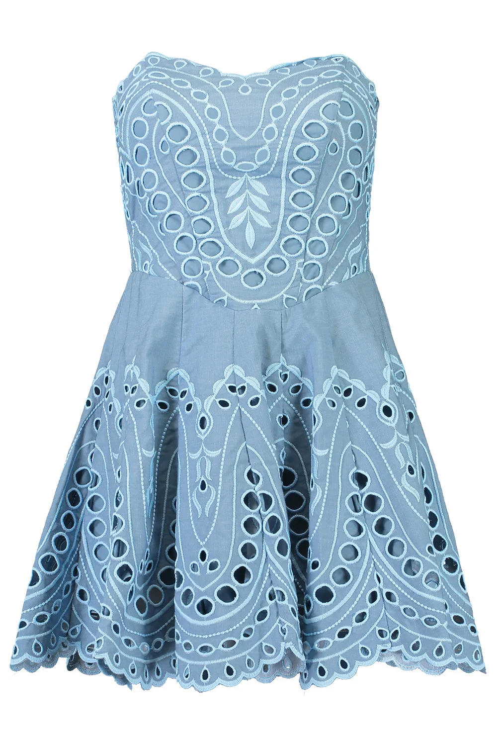 DETAILS AND INSIGHT Charo Ruiz Ibiza bail short dress in blue sealace. 70% Cotton, 30% Polyester Dry Clean Made in Ibiza Style 263601-BLUE SEALACE