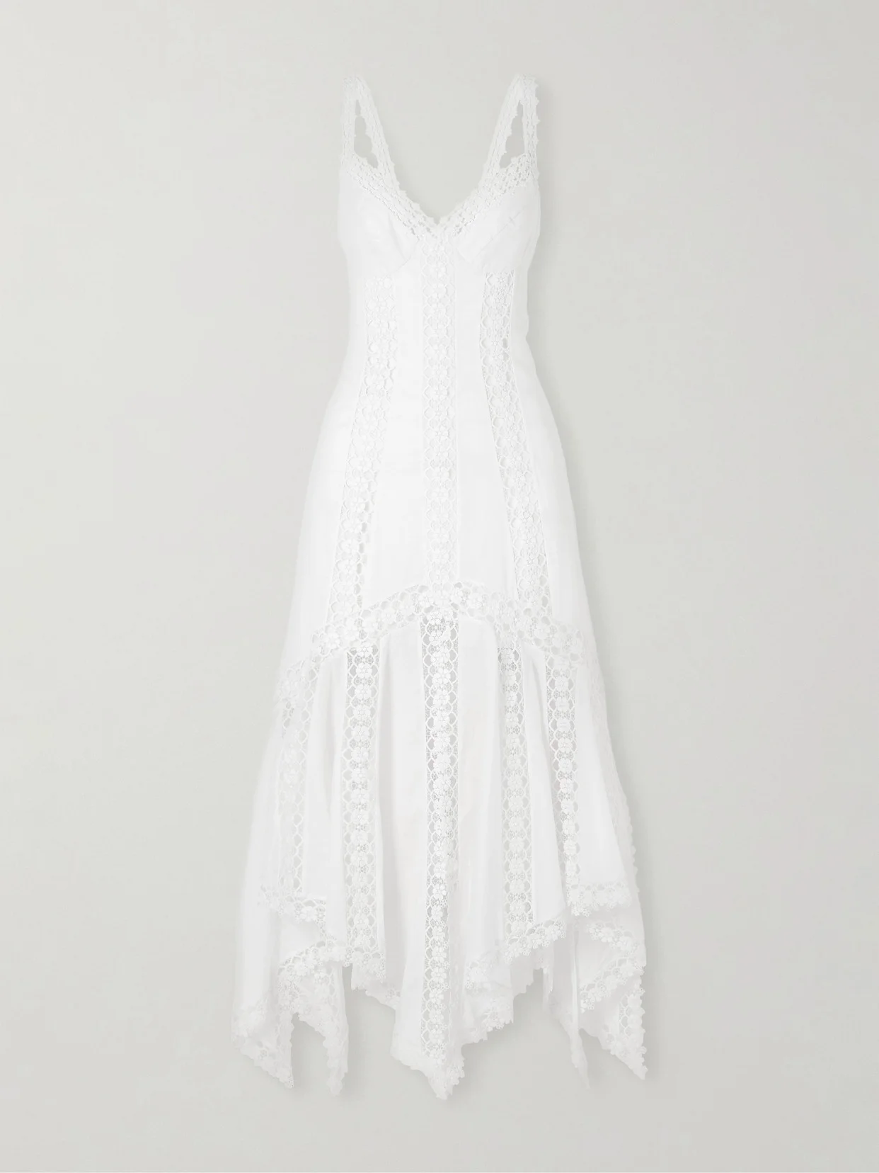Embroidered lace softens the sharp lines of this 'Blossel' dress. Made from cotton-blend, it has a sweetheart neckline and an asymmetrical skirt with multiple slits. Style yours with hoop earrings and a pendant necklace.