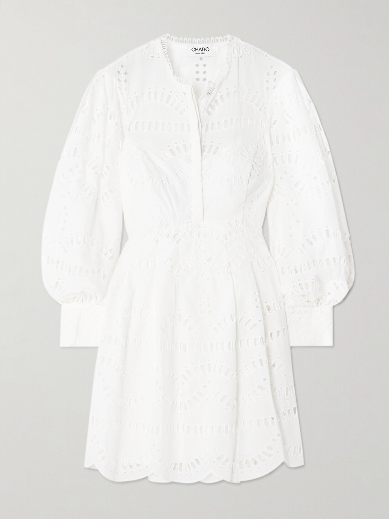 Broderie anglaise patterns Charo Ruiz's 'Franca' dress, a detail that's at once pretty and comfortably airy, too. It's made from cotton-blend with elegant blouson sleeves and a gathered skirt.