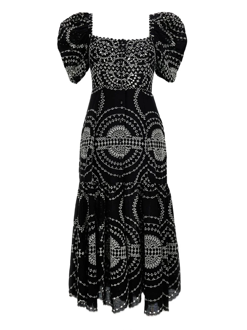 puff-sleeve embroidered dress Highlights - Black - Intricate embroidery - Square neckline - Voluminous puff sleeves - Tiered skirt - Gathered detailing Imported Composition Cotton 60%, Linen/Flax 20%, Polyester 20% Washing instructions Read Manufacturer Guidelines