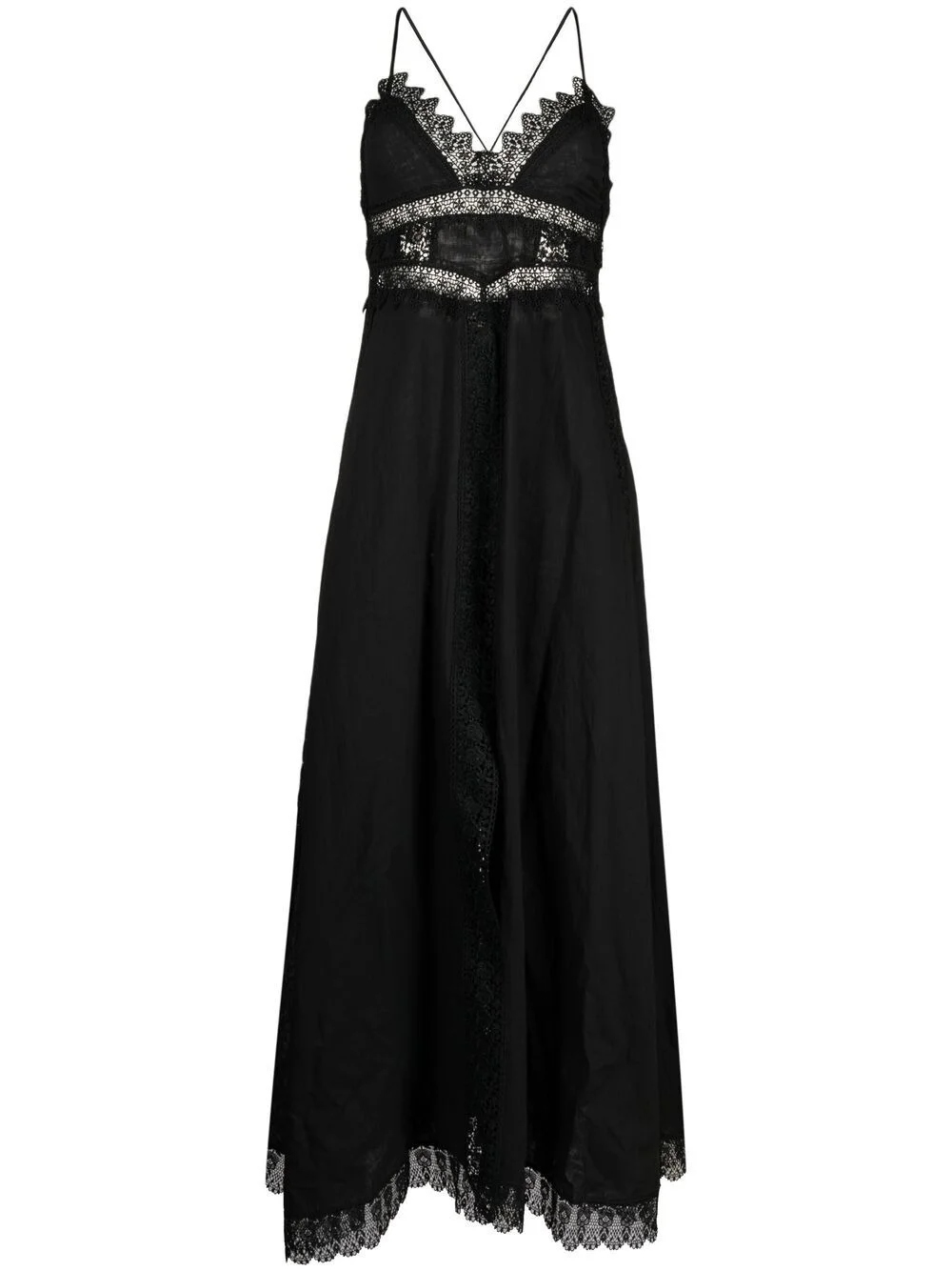 lace-trimmed maxi dress black lace trim V-neck spaghetti straps A-line maxi Imported Composition Outer: Cotton 90%, Polyester 10% SIZE & FIT Model measurements Height 5 ft 10 in(1.78 m) Bust/Chest 31.49 in(80 cm) Hips 36.22 in(92 cm) Waist 25.59 in(65 cm) Measurement HIPS 37.99 in(96.5 cm) LENGTH 57.99 in(147.3 cm) WAIST 30.98 in(78.7 cm) BUST 25.98 in(66 cm) FittingInformation This piece fits true to size. We recommend you get your regular size Designed for a close fit at the bust and waist, but loose at the hip Made with a mid-weight non-stretch fabric Washing instructions Dry Clean Only