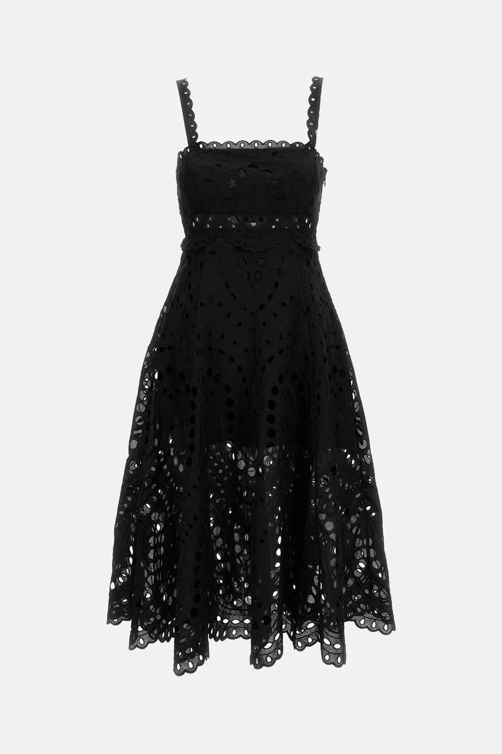 Long dress in cotton blend with eyelet lace Standard fit Fitted bodice with thin straps and full skirt Fully lined Construction with elastic insert at the back for ease of wear. Side zipper Color: black Details and Care Color: Nero Composition: 60% CO 40% PL Made in: Portugal Sku: 263611BLACK