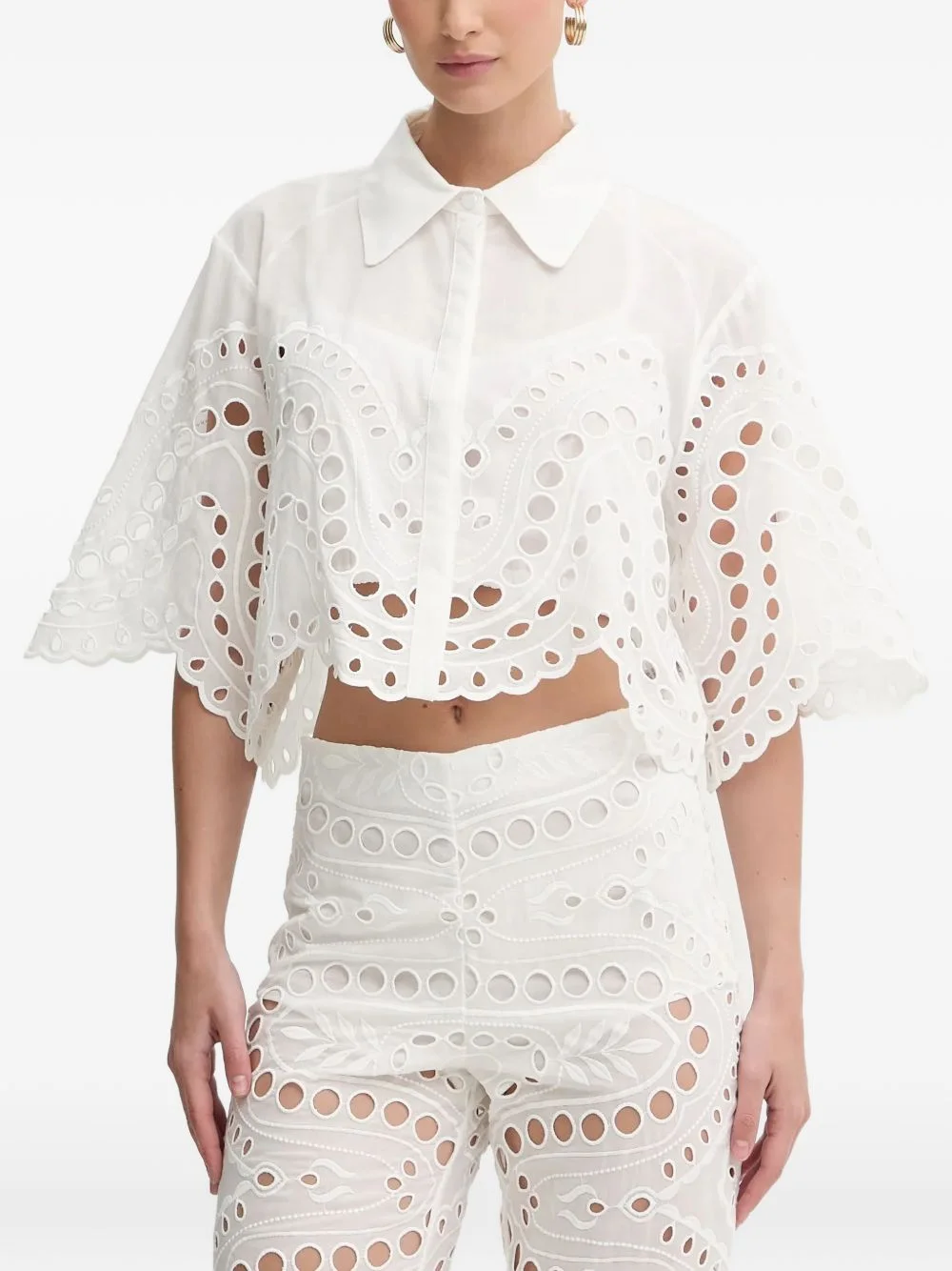 Storm scallop-trim eyelet blouse Highlights - White - Eyelet detail - Scalloped trim - Cropped - Spread collar - Short sleeves Imported Composition Cotton 70%, Polyester 30% Washing instructions Read Manufacturer Guidelines