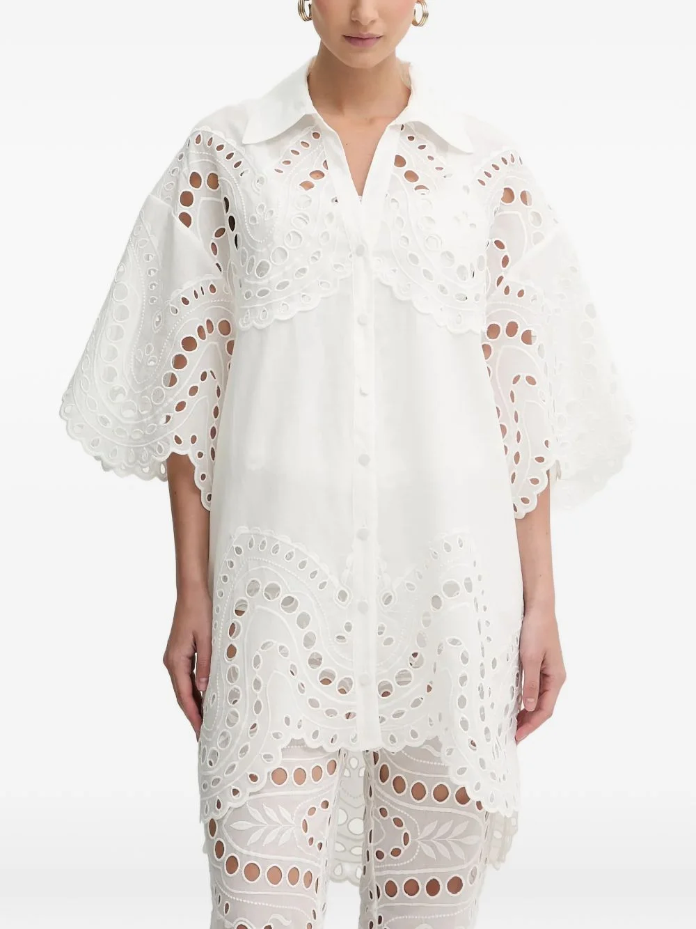 Tao broderie anglaise top Highlights - White - Broderie anglaise detailing - Front button fastening - Short sleeves - Point collar - Scalloped trim Imported Composition Cotton 70%, Polyester 30% Washing instructions Read Manufacturer Guidelines