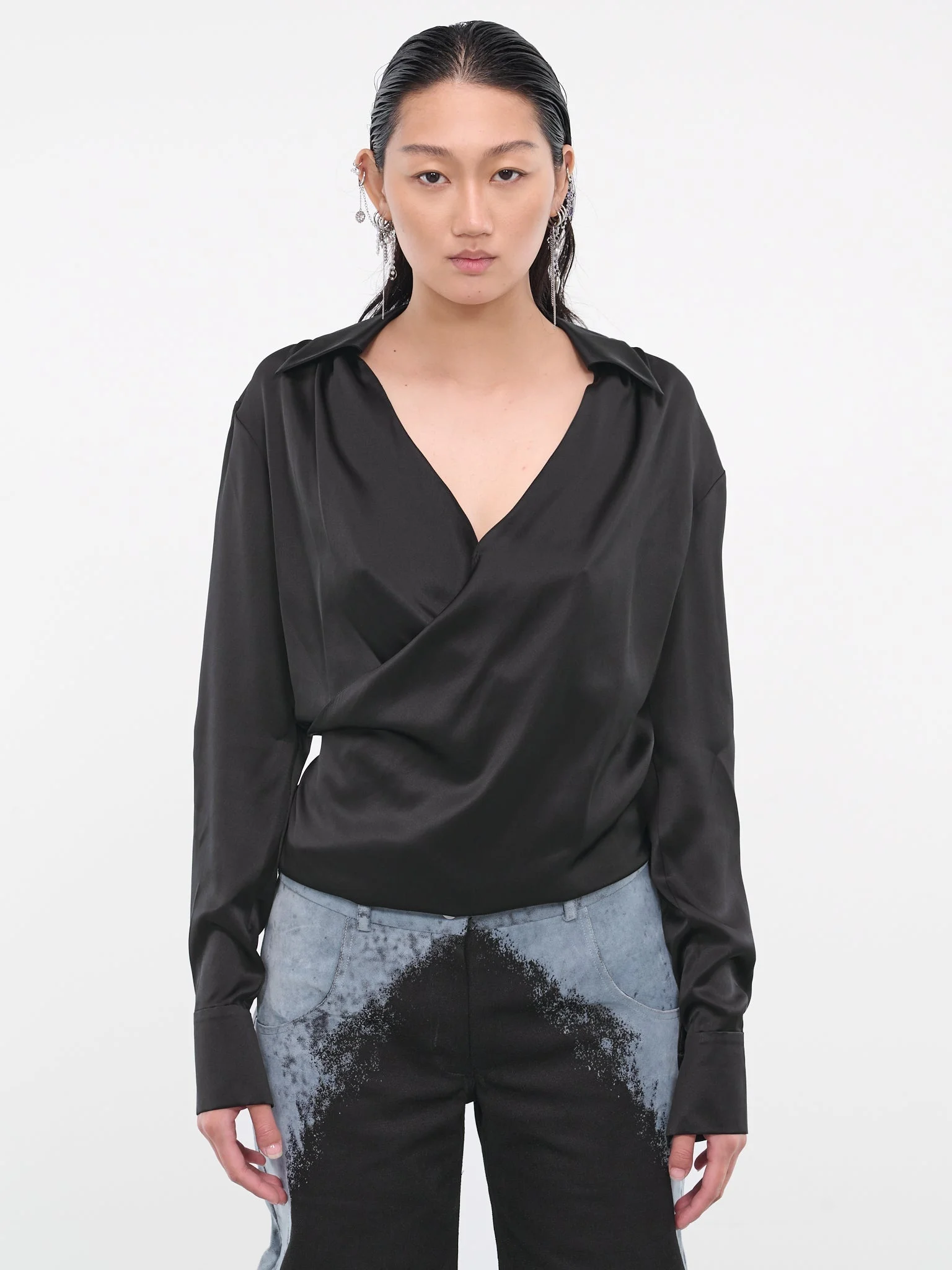 CHET LO black top, draped wrap design, silk satin, plunging v-neck, pointed collar, elongated sleeves, barrel cuffs, relaxed fit. UK Sizing Model is 5'10" wearing size 8. Bust: 31" Waist: 23.5" Hips: 35"