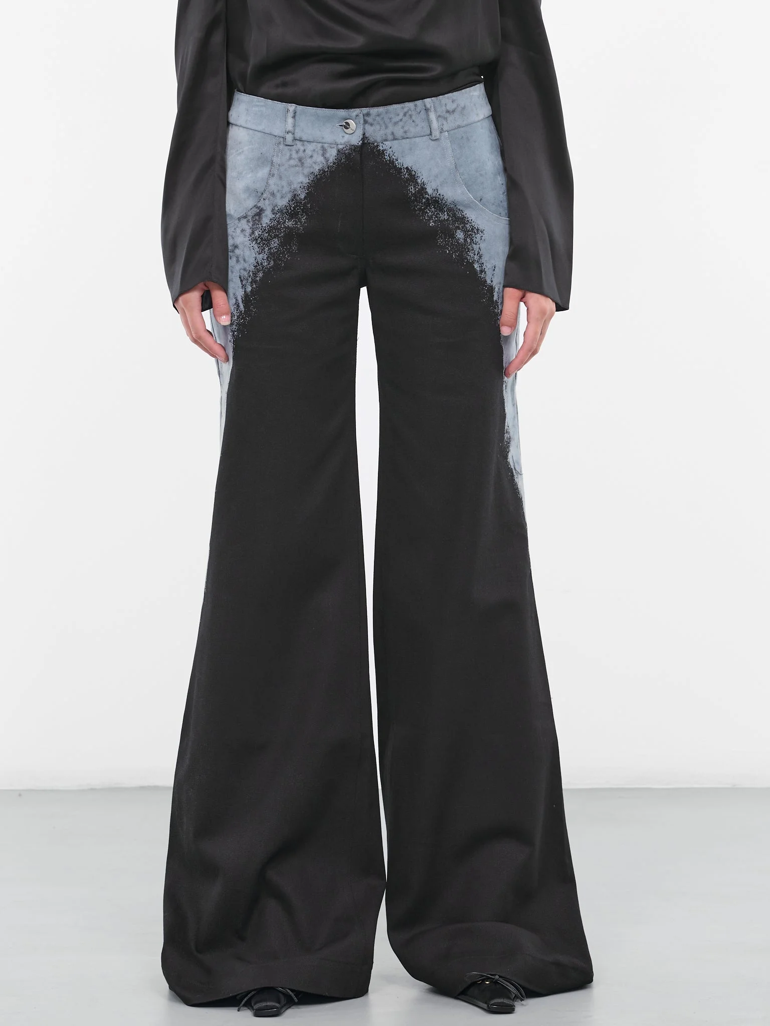 CHET LO black trousers, flared silhouette, felted detailing, low-waist, belt loops, button & zip-fly, four pockets, full length, wide leg, regular fit. UK Sizing Model is 5'10" wearing size 8. Bust: 31" Waist: 23.5" Hips: 35"