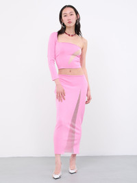 CHET LO skirt in pink, slashed design, mesh panels, knit construction, mid-waist, maxi length, slim fit. Made in UK Numeric Sizing 82% Viscose, 17% Polyester, 1% Polyamide Model is 5'9" wearing size 1. Bust: 32" Waist: 24" Hip: 34"