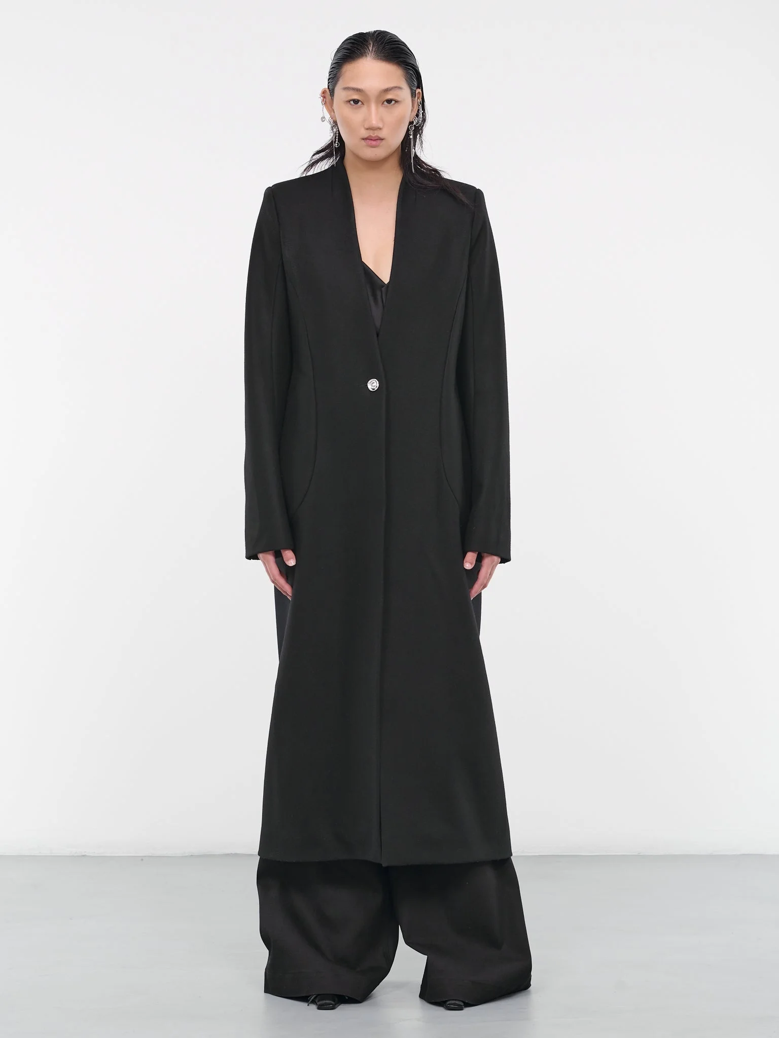 CHET LO black coat, paneled wool construction, plunging neckline, padded shoulders, snap button closure, side welt pockets, back vent, satin lining, full length, tailored fit. UK Sizing Model is 5'10" wearing size 8. Bust: 31" Waist: 23.5" Hips: 35"