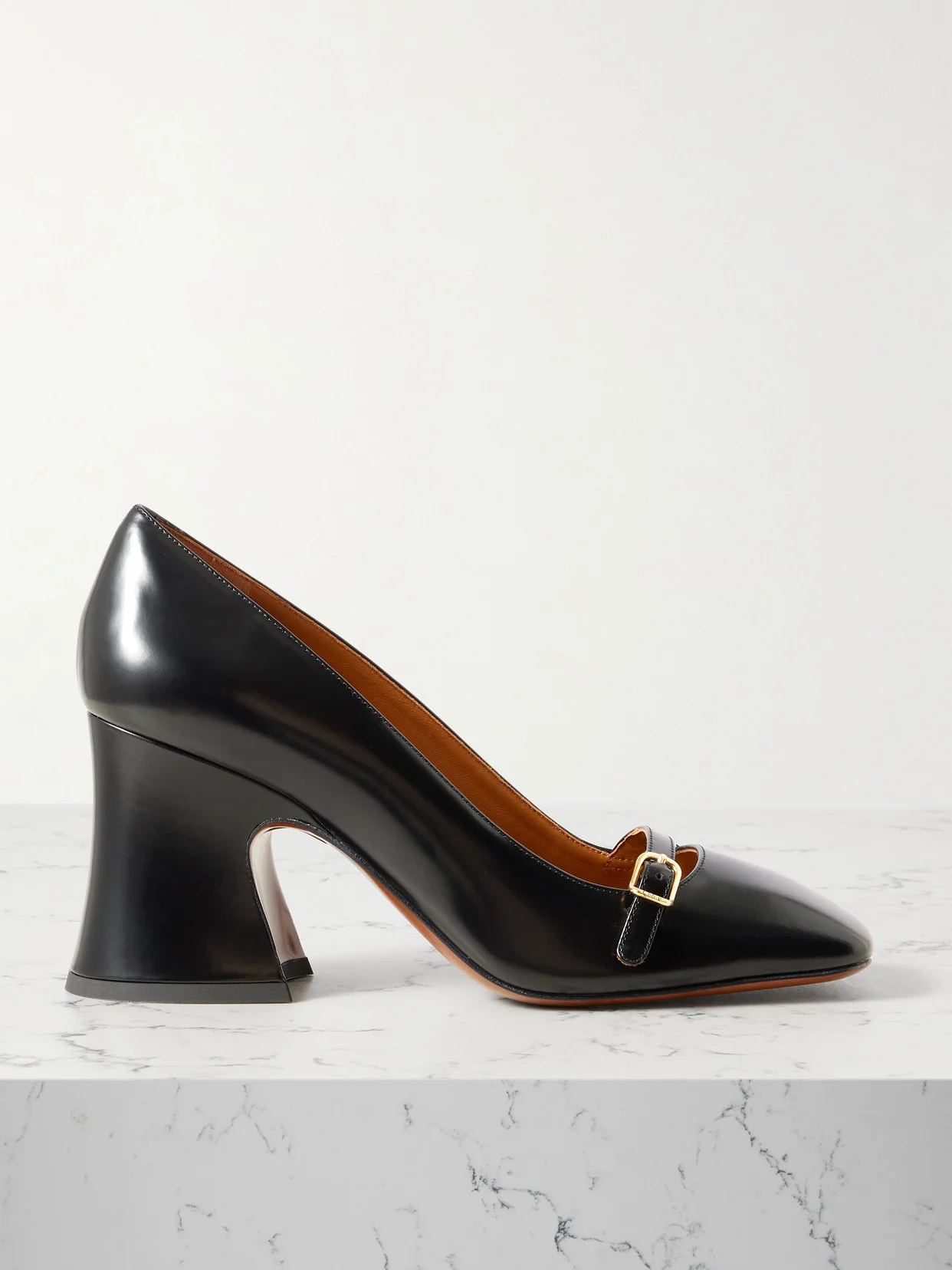 Chloe's 'Janis' pumps exude retro charm. They've been crafted in Italy from glossed-leather and have thin buckled straps. The curved, 80mm block heels look especially good with swishy skirts or dresses.