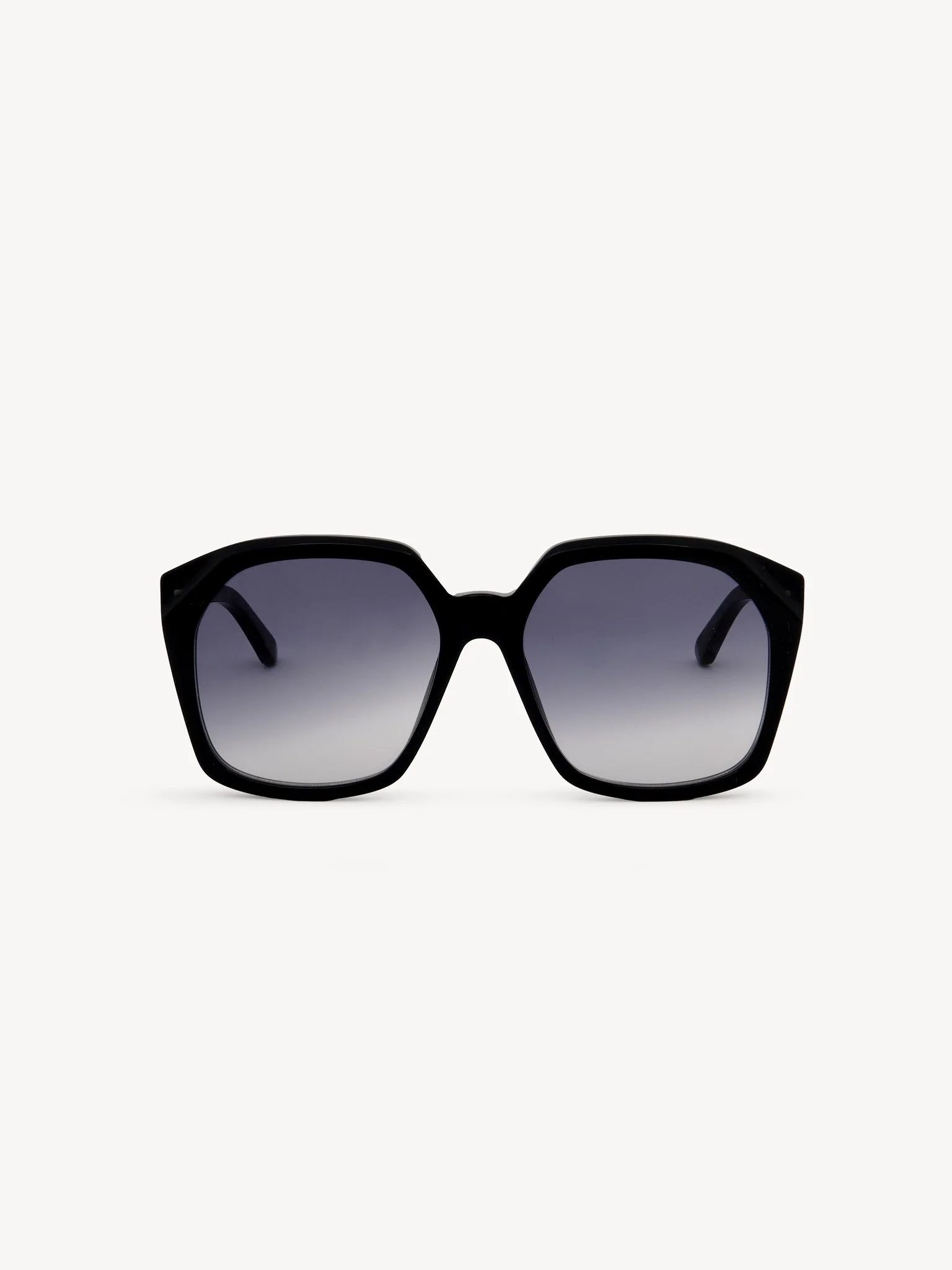 Square Salome sunglasses with a sharp design and scallop details for a '70s-inspired aesthetic. Made from lower-impact acetate, the shiny transparent dark gray frame is paired with gradient blue/crystal lenses in bio-based nylon. A gold-toned Chloe logo plate signs both temples. PRODUCT DETAILS Square sunglasses in lower impact acetate & bio-based nylon - 100% UVA and UVB protection - Not prescription friendly - Filter category: 2 - Chloe logo engraved on both temples These sunglasses come with a case and lens cloth - Lens: 2.2" (57 mm) - Bridge: 0.7" (17 mm) - Temple: 5.5" (140 mm) - Dark Havana frame - Gradient blue/crystal lenses Item code: CHC24WEK0280001