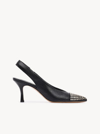 DESCRIPTION Crafted from perforated supple lambskin, these Alba slingback pumps feature a pointed toe finished with patinated silver-tone studs. The elasticated padded ankle strap ensures a comfortable fit. PRODUCT DETAILS Pump heel height: 3" (7.5 cm) Heel-to-toe drop: 3" (7.5 cm) Upper: lambskin Inner sole: lambskin Main lining: lambskin Sole: cowhide Heel: cowhide Fit true to size, European sizing - Slip-on To make this product, Chloe worked with Leather Working Group (LWG) certified leather manufacturers. LWG certifies tanneries based on their water and energy usage, management of chemicals, solid waste, and wastewater. Color: Black Item code: CH26S16HWL001