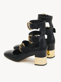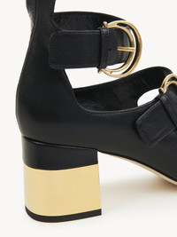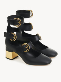 Crafted from shiny goatskin, the Alizè high heels feature the C buckle from the Maison's Archives with a revamped double-ring design. Multiple straps combine with a modern square toe and a gold-toned block heel for a Parisian attitude. A Chloé logo signs the insole, while an embossed Chloé logo finishes the outsole. PRODUCT DETAILS Pump heel height: 0.4" (6.5 cm) Heel-to-toe drop: 0.2" (5.5 cm) Upper: shiny goatskin Inner sole: kidskin Main lining: kidskin Sole: cowhide Heel: acrylonitrile butadiene styren Fit true to size, European sizing - Multi-buckle fastening To make this product, Chloé worked with Leather Working Group (LWG) certified leather manufacturers. LWG certifies tanneries based on their water and energy usage, management of chemicals, solid waste, and wastewater. Color: Black Item code: CHC24A03GMC001