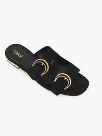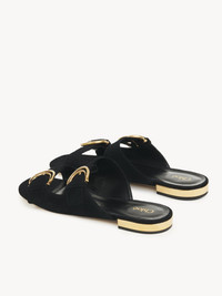 Crafted from suede cowhide, the Alizè slide features the C buckle from the Maison's Archives with a revamped double-ring design. This slip-on style combines double buckled straps with a modern square toe and gold-toned heels. A Chloé logo signs the insole, while an embossed Chloé logo finishes the outsole of these slides. PRODUCT DETAILS Slide heel height: 0.4" (1 cm) Heel-to-toe drop: 0.2" (0.5 cm) Upper: split suede cowhide Inner sole: goatskin Main lining: kidskin Sole: cowhide Heel: acrylonitrile butadiene styren Fit true to size, European sizing - Slip-on To make this product, Chloé worked with Leather Working Group (LWG) certified leather manufacturers. LWG certifies tanneries based on their water and energy usage, management of chemicals, solid waste, and wastewater. Color: Black Item code: CHC24A03BLZ001