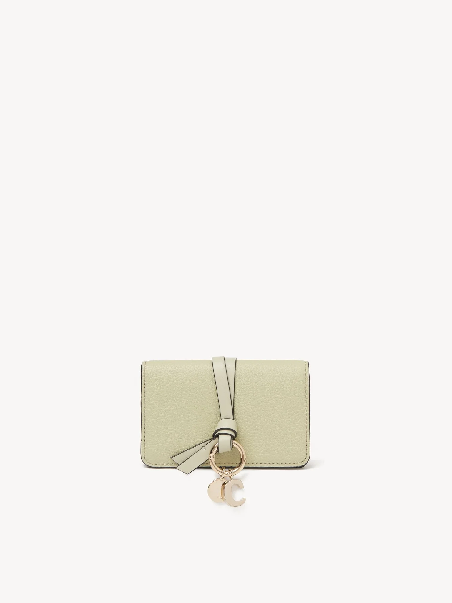 The Maison's iconic Alphabet line includes this compact card holder in grained and shiny calfskin. Sized to slip easily into a clutch or small bag, it features one main compartment and one flat pocket. Knotted leather links detail the front, finished with Chloé-designed golden initial charms. All about Alphabet... The Alphabet line allows you to personalize your accessory by attaching your initial charm or a secret message to the golden hardware. PRODUCT DETAILS Card holder in grained & shiny calfskin Main lining: 65% Polyester, 35% Cotton - 1 main compartment - 1 card slot - 1 internal flat pocket Comes with a dust bag - Width: 4.4" (11.2 cm) - Height: 2.6" (6.7 cm) - Depth: 1" (2.5 cm) This small purse is made from semi-aniline leather. Tanning imparts a specific character to the skin, such as hues and wrinkles, combined with a light and transparent aniline finish. Respect the care instructions on the leaflet. To make this product, Chloé worked with Leather Working Group (LWG) certified leather manufacturers. LWG certifies tanneries based on their water and energy usage, management of chemicals, solid waste, and wastewater. Color: Light Eucalyptus Item code: CHC21WP014F5738A