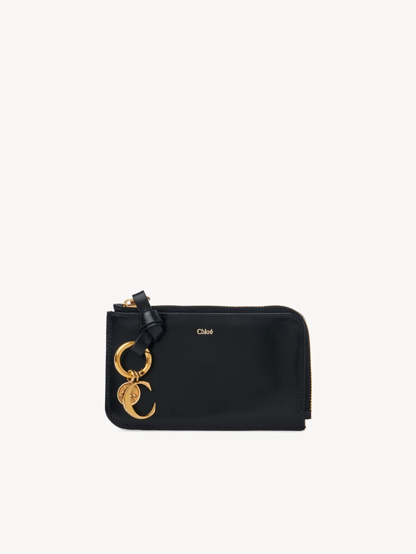 The Maison's iconic Alphabet line includes this purse in shiny calfskin. Sized to fit your essentials, it features multiple card slots and a flat pocket at the back. A knotted leather link is embellished with Chloe's signature golden initial and Horse Medal charms. PRODUCT DETAILS Purse in shiny calfskin Main lining: Calfskin Inner lining: 65% Polyester, 35% Cotton - 1 main zipped compartment - 4 card slots - 1 flat pocket - Zip closure Comes with a dust bag - Width: 5.1" (13 cm) - Height: 3" (7.5 cm) - Depth: 0.8" (2 cm) This purse is made from semi-aniline leather. Tanning imparts a specific character to the skin, such as hues and wrinkles, combined with a light and transparent aniline finish. Respect the care instructions on the leaflet. To make this product, Chloe worked with Leather Working Group (LWG) certified leather manufacturers. LWG certifies tanneries based on their water and energy usage, management of chemicals, solid waste, and wastewater. Color: Black Item code: CHC25SP535O16001