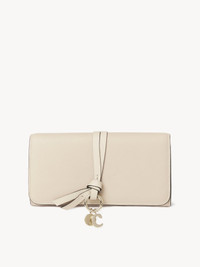 The Maison's iconic Alphabet line includes this long wallet with flap in grained and shiny calfskin. A practical accessory, it features a roomy compartment and multiple card slots. Knotted leather links embellished with Chloé-designed golden initial charms detail the front flap. All about Alphabet... The Alphabet line allows you to personalize your accessory by attaching your initial charm or a secret message to the golden hardware. PRODUCT DETAILS Long wallet with flap in grained & shiny calfskin Main lining: Lambskin - Snap button closure - 1 main compartment - 1 flat pocket - 1 back outside flat pocket - 12 card slots - 1 zipped pocket Comes with a dust bag - Width: 7.5" (19 cm) - Height: 3.7" (9.5 cm) - Depth: 0.8" (2 cm) This long wallet is made from semi-aniline leather. The half-transparent finish imparts a robust nature to the product while preserving its natural character. Respect the care instructions on the leaflet. To make this product, Chloé worked with Leather Working Group (LWG) certified leather manufacturers. LWG certifies tanneries based on their water and energy usage, management of chemicals, solid waste, and wastewater. Color: Sweet Beige Item code: CHC21WP715F5724Q