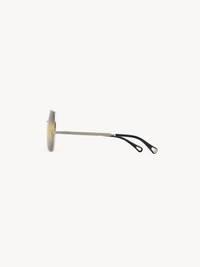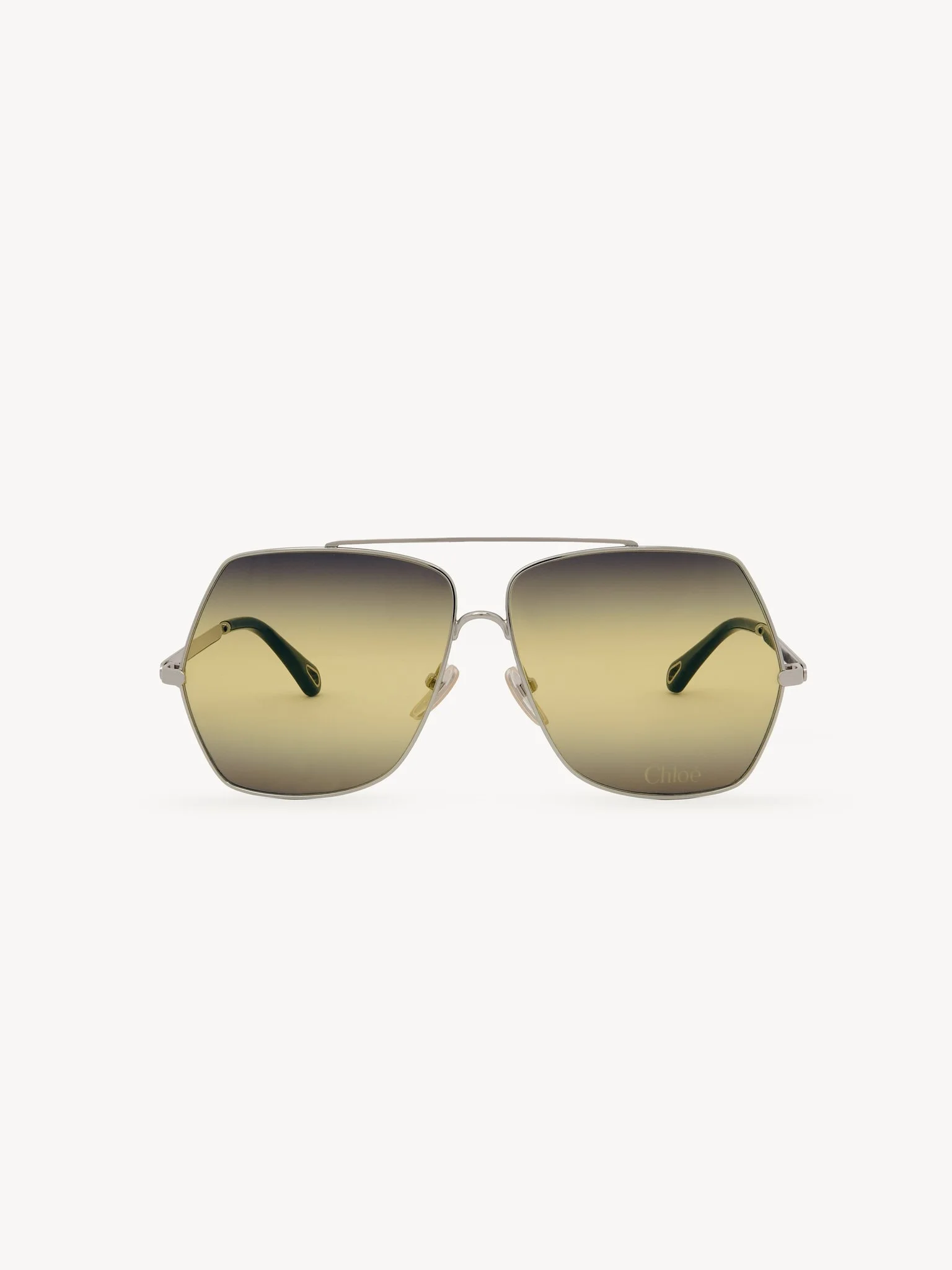 These Aly sunglasses offer a modern update on the classic aviator shape. Square frames in shiny silver metal are set with triple gradient lenses in a palette of black, yellow and gray. The Chloe logo finishes the left lens. Drop-shaped openings at the temple tips make these sunglasses compatible with Chloe's eyewear jewelry. PRODUCT DETAILS Square aviator sunglasses in metal & bio-based nylon - 100% UVA and UVB protection - Adjustable nose pads - Acetate temple tips - Not prescription friendly - Chloe logo engraved on the temples - Filter category: 1 These sunglasses come with a case and lens cloth - Lens: 2.4" (62 mm) - Bridge: 0.5" (12 mm) - Temple: 5.5" (140 mm) - Shiny silver frame - Gradient black, yellow & gray lenses Item code: CHC24AEK0278313