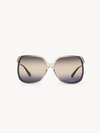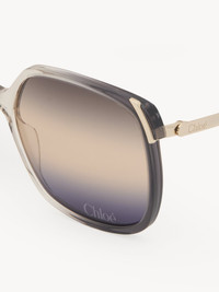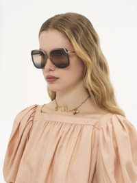 These Aly square sunglasses have a 70s-style frame in a mix of gradient dark gray lower-impact acetate and shiny gold metal. The triple gradient lenses in blue, cream and blue are signed with the Chloe logo. Drop-shaped openings at the temple tips make these sunglasses compatible with Chloe's eyewear jewelry. PRODUCT DETAILS Square sunglasses in lower-impact acetate, gold metal & bio-based nylon - 100% UVA and UVB protection - Not prescription friendly - Chloe logo engraved on the temples - Filter category: 1 These sunglasses come with a case and lens cloth - Lens: 2.4" (60 mm) - Bridge: 0.6" (15 mm) - Temple: 5.5" (140 mm) These sunglasses are made with carefully selected materials. Please handle with care for a longer product life. - Store in the case provided. - Clean with a soft, dry cloth. - If necessary, use a damp cloth and mild detergent. Do not use solvents or aggressive detergents which may alter the features of the sunglasses. - Gradient dark gray lower-impact acetate & gold metal frame - Gradient blue, cream & blue lenses Item code: CHC25SEK0286774