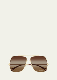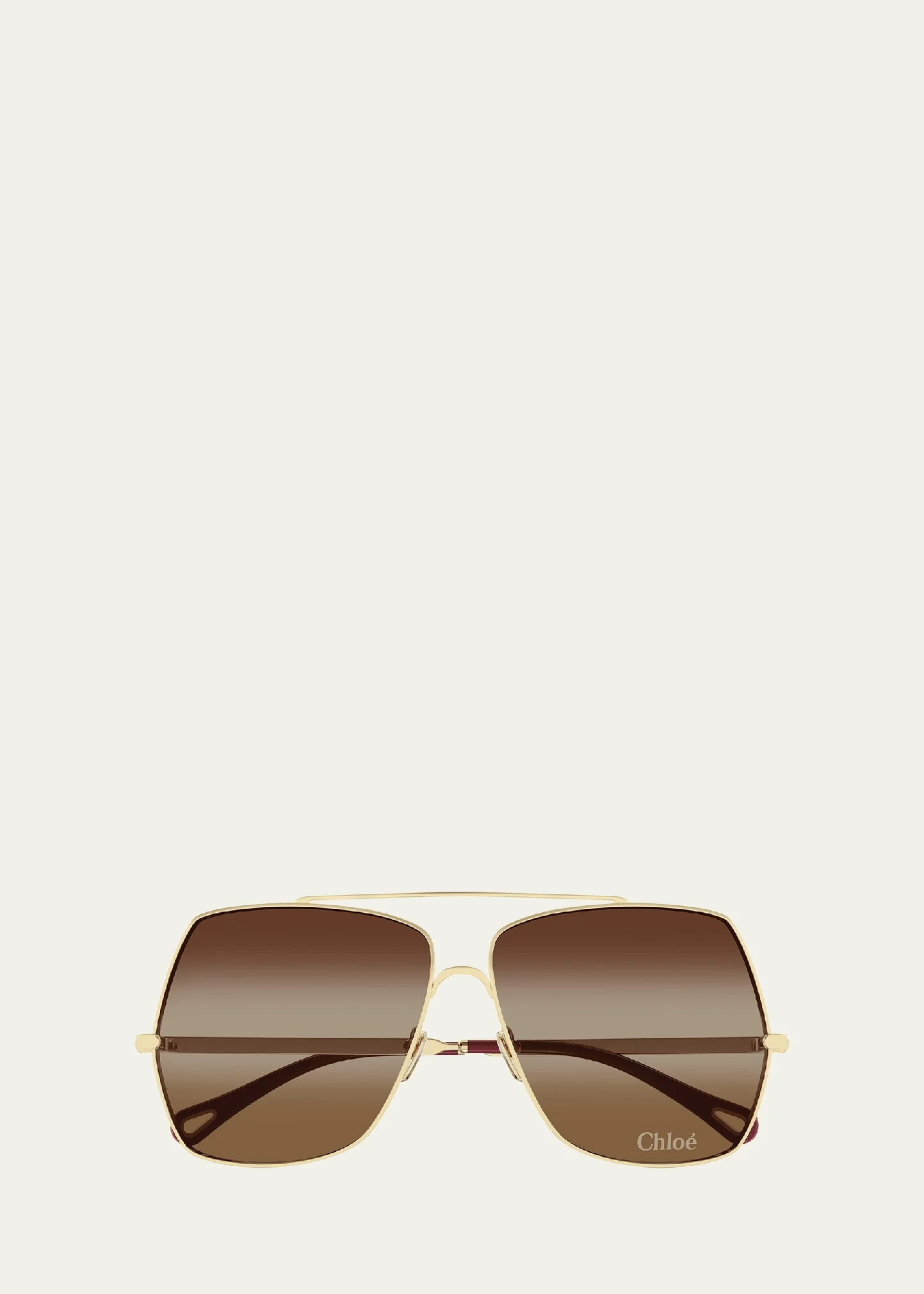 Chloe aviator sunglasses in metal Lens/bridge/temple (in mm): 62-12-140 Gradient lenses Left lens logo script Metal top bar Adjustable nose pads Signature logo on temples Thin, tapered arms Capped earpieces 100% UVA/UVB protection Made in Italy Proposition 65 warning for California residents Online Inquiries: BGS21_D509J| Store Inquiries: #4869802