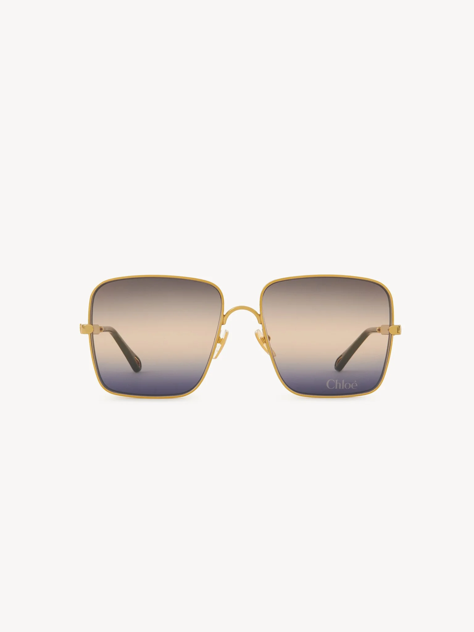 These Aly square sunglasses pair a thick graphic frame in shiny gold-tone metal with gradient beige to blue lenses. The Chloe logo finishes the left lens. Drop-shaped openings at the temple tips make these sunglasses compatible with Chloe's eyewear jewelry. PRODUCT DETAILS Square sunglasses in gold metal & bio-based nylon - 100% UVA and UVB protection - Adjustable nose pads - Not prescription friendly - Chloe logo engraved on the temples - Filter category: 1 These sunglasses come with a case and lens cloth - Lens: 2.4" (61 mm) - Bridge: 0.7" (17 mm) - Temple: 5.5" (140 mm) - Gold metal frame - Gradient beige to blue lenses Item code: CH25WEK0324819