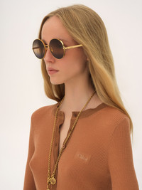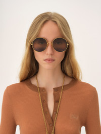 DESCRIPTION These Aly round sunglasses pair a thick frame in shiny gold-tone metal with triple gradient lenses in a palette of blue, beige and brown. The Chloe logo finishes the left lens. Drop-shaped openings at the temple tips make these sunglasses compatible with Chloe's eyewear jewelry. PRODUCT DETAILS Round sunglasses in gold metal & bio-based nylon - 100% UVA and UVB protection - Adjustable nose pads engraved with the Chloe logo - Not prescription friendly - Chloe logo engraved on the temples - Filter category: 1 These sunglasses come with a case and lens cloth - Lens: 2.3" (59 mm) - Bridge: 0.7" (17 mm) - Temple: 5.5" (141 mm) - Gold metal frame - Gradient blue, beige and brown lenses Item code: CH25UEK0321819 CARE INSTRUCTIONS These sunglasses/eyeglasses are made with carefully selected materials. Please handle with care for a longer product life.- Store in the case provided.- Clean with a soft, dry cloth.- If necessary, use a damp cloth and mild detergent. Do not use solvents or aggressive detergents which may alter the features of the sunglasses/eyewear