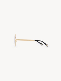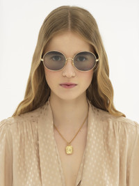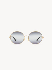 These Aly round sunglasses pair a lightweight graphic frame in shiny gold-tone metal with triple gradient lenses in a palette of black, light gray and gray. The Chloe logo finishes the left lens. Drop-shaped openings at the temple tips make these sunglasses compatible with Chloe's eyewear jewelry. PRODUCT DETAILS Round sunglasses in gold metal & bio-based nylon - 100% UVA and UVB protection - Not prescription friendly - Chloe logo engraved on the temples - Filter category: 1 These sunglasses come with a case and lens cloth - Lens: 2.3" (59 mm) - Bridge: 0.7" (17 mm) - Temple: 5.5" (140 mm) - Gold metal frame - Gradient black, light gray & gray lenses Item code: CHC25SEK0281774