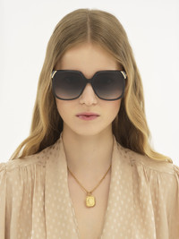 These Aly square sunglasses have a 70s-style frame in a mix of dark gray lower-impact acetate and shiny gold metal. The gradient blue lenses are signed with the Chloe logo. Drop-shaped openings at the temple tips make these sunglasses compatible with Chloe's eyewear jewelry. PRODUCT DETAILS Square sunglasses in lower-impact acetate, gold metal & bio-based nylon - 100% UVA and UVB protection - Not prescription friendly - Chloe logo engraved on the temples - Filter category: 3 These sunglasses come with a case and lens cloth - Lens: 2.4" (60 mm) - Bridge: 0.6" (15 mm) - Temple: 5.5" (140 mm) - Dark gray lower-impact acetate & gold metal frame - Gradient blue lenses Item code: CHC25SEK0286744