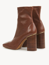 Crafted from smooth stretchy lambskin, these Ambre ankle boots combine a high fitted ankle and a modern square toe. Elevated by a wood-effect block heel, they are set with a gold insert at the back with an embossed Chloé logo on the insole. A hidden platform inside the boot ensures comfort. PRODUCT DETAILS Ankle boot heel height: 3.7" (9.5 cm) Heel-to-toe drop: 3" (7.5 cm) Upper: stretch lambskin Inner sole: calfskin Main lining: calfskin Sole: cowhide Heel: cowhide Fit true to size, European sizing - Zipper fastening To make this product, Chloé worked with Leather Working Group (LWG) certified leather manufacturers. LWG certifies tanneries based on their water and energy usage, management of chemicals, solid waste, and wastewater. Color: Cognac Brown Item code: CHC24A03ALY246
